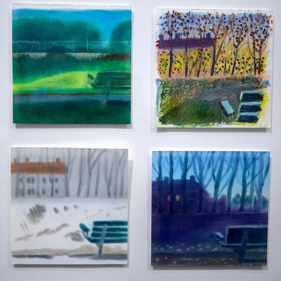 Samma utsikt från fönstret, ena halvan av en parkbänk, marken och träden, fint målade med pastell av Siri Ahmed Backström under olika årstider och vid olika tidpunkter på dagen under nästan tre års tid, alla målningar sammanställda bredvid varandra inom samma ram, ett av många fascinerande verk på årets Vårsalong som nu öppnar på Liljevalchs.