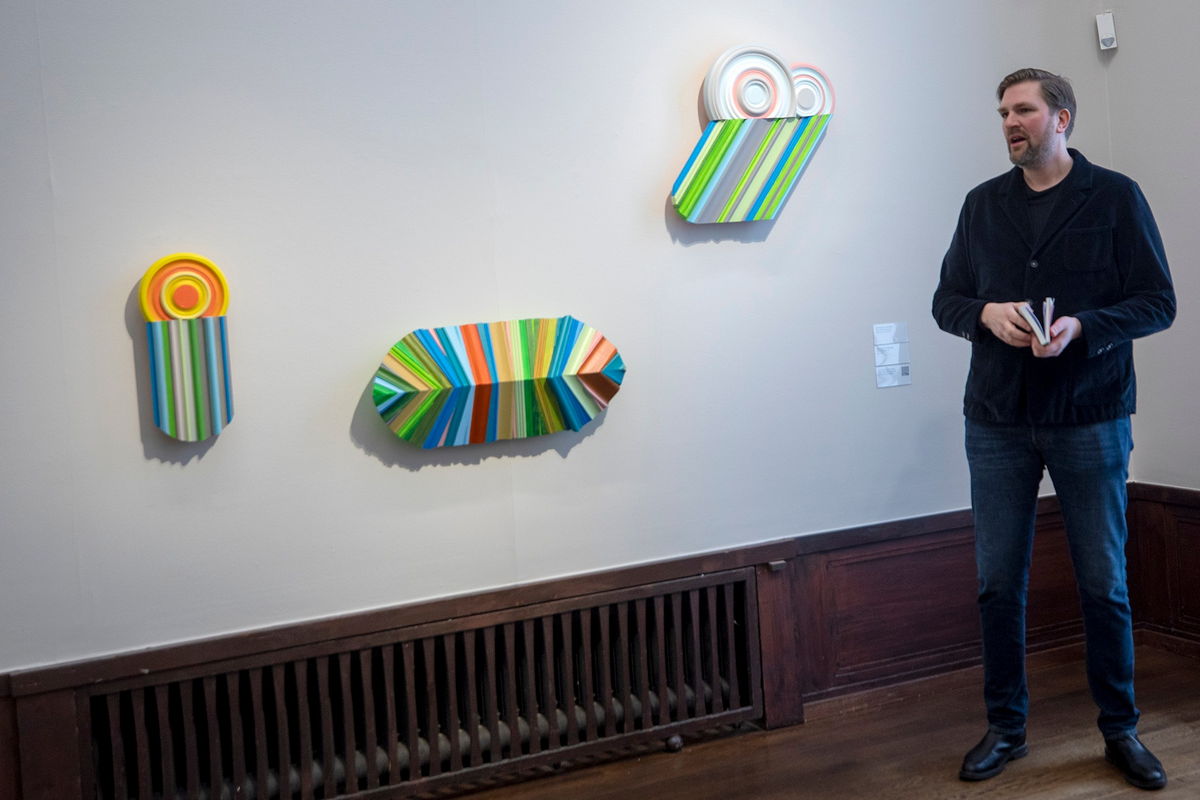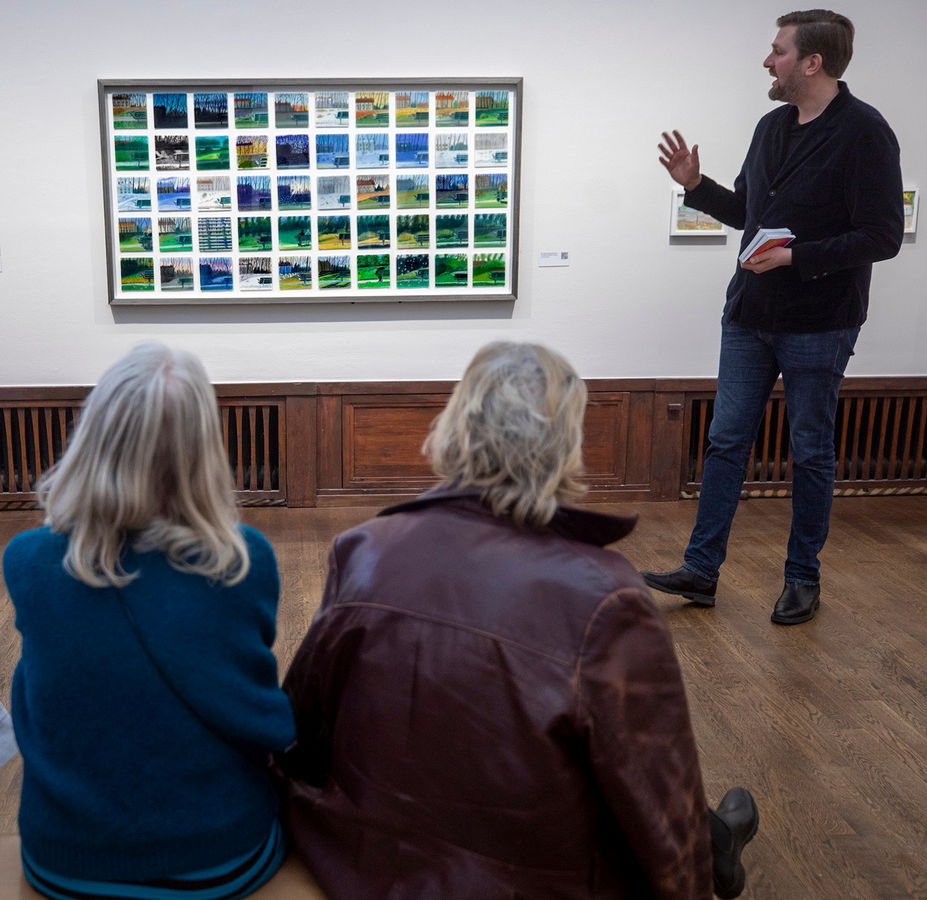 Juryordföranden och vice konsthallschefen Isak Nilson visade årets Vårsalong för pressen inför fredagens vernissage. Här visar han Siri Ahmed Backströms målningar av samma motiv, utsikten från ett fönster under olika årstider gjorda under en tidsperiod på närmare tre år