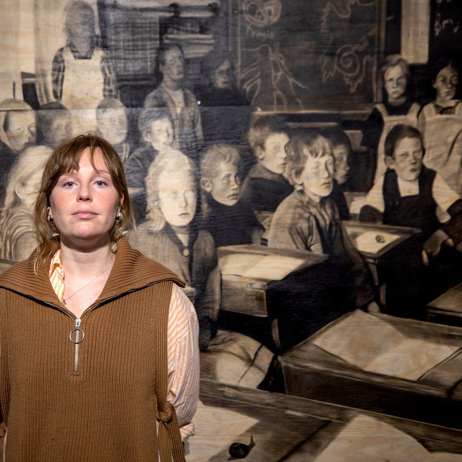 Även Rebecka Tollens suggestiva kolteckning på plywoodskivor av en skolklass med tungsinta barn som hämtad från en längesedan förgången tid gjorde djupt intryck på mig och fick mig också att i minnet återkalla Peter Tillbergs (1946–2016) klassiska, oroväckande målning ”Blir du lönsam, lille vän?”, skolklassen där alla barnen i skolbänkarna med nollställda blickar tittar rakt fram utom en pojke som tittar ut genom fönstret.