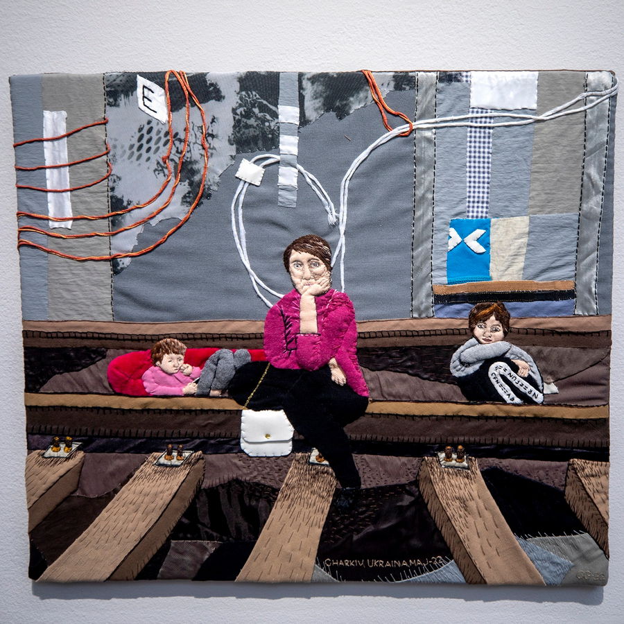 Det finns mycket att stanna till inför och reflektera över på årets vårsalong som t. ex. Charlotta Grunewalds realistiska tygapplikationer med broderi skildrande gripande situationer i det krigsdrabbade Ukraina, en av dessa med titeln ”Tunnelbanan har blivit deras hem” föreställer en hemlös familj.
