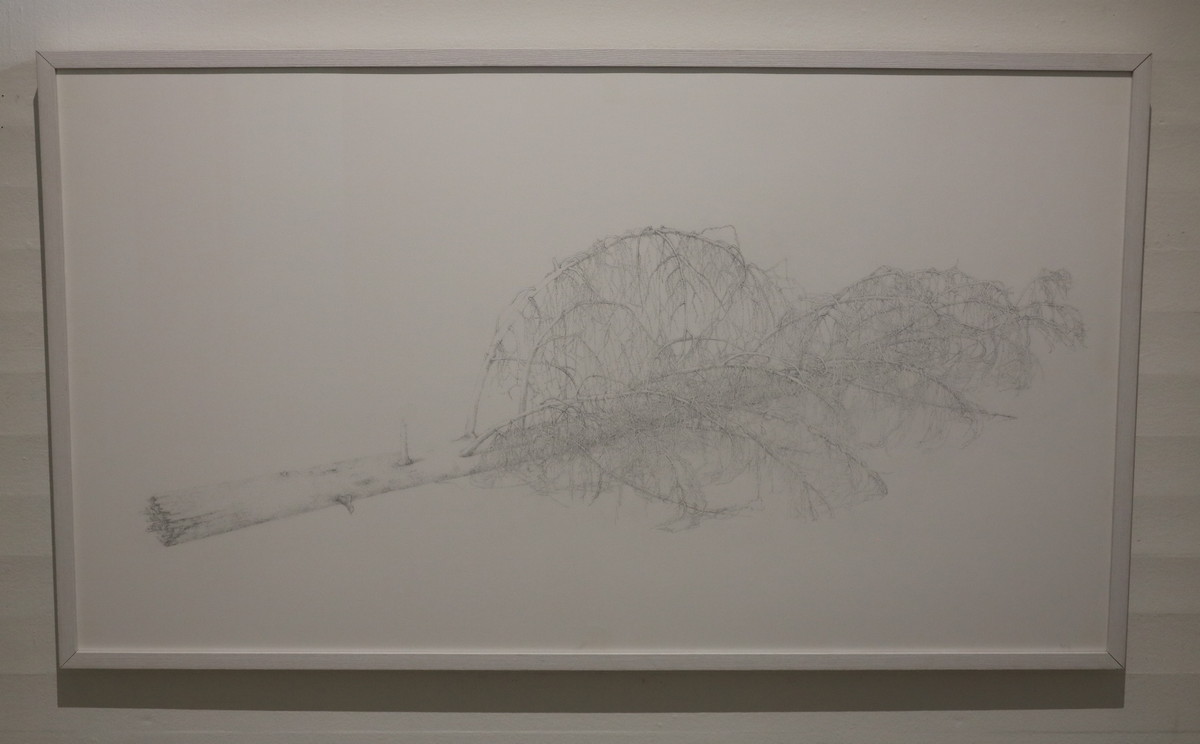 Det mest spännande i hennes utställningsdel är några vackra bilder av träd i blyerts. De är lätt och skirt gjorda på ett sätt som känns empatiskt, ömsint ömtåligt. De är gjorda i en prickteknik som för mina tankar till en del av Folke Dahlbergs bilder. Hennes är i mina ögon mjukare, sensiblare och därför mer sensuella. Genom att i bilden lyfta ut ett speciellt träd ur sin miljö betonar hon dess särart och speciella omistlighet.