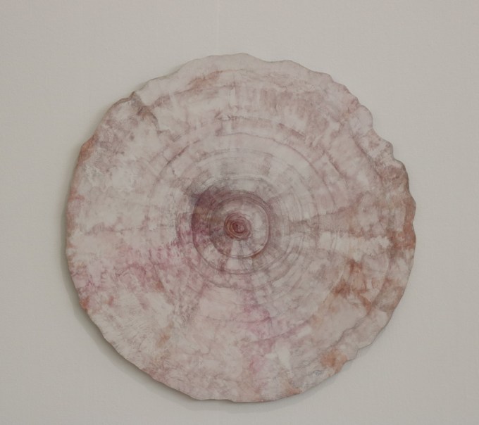 Åsa Herrgård visar också skulpturalt avsågade stammar med former som liknar bävergnag. Om det är hon eller djuren som format de två koner som möter varandra framgår inte för mig. Gränserna mellan natur och kultur flyter igen. På en vägg har hon en variant av den gyllene cirkel som blir så särskilt effektfull när den träffas av solen. Det hände inte under mitt besök på utställningen.