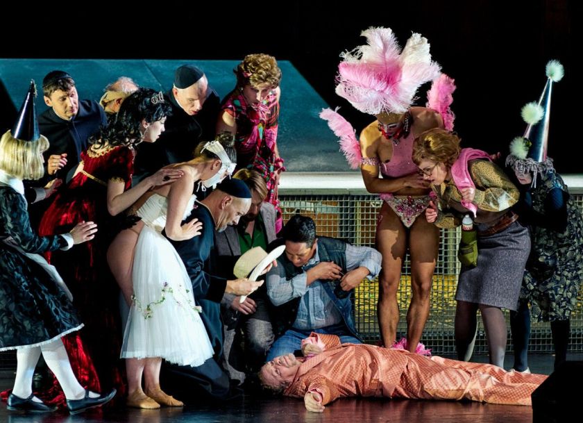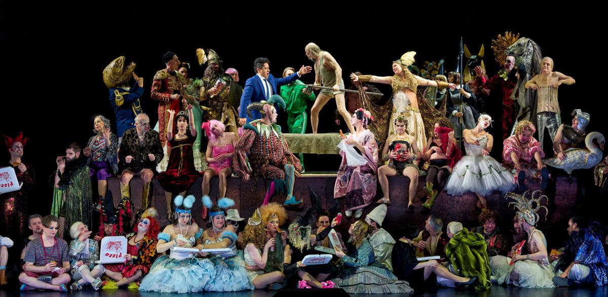 Nästan direkt översköljs, ja nästa översvämmas, scenrummet av operatruppens färgsprakande ja nästan bländande överdåd av figurer. Många i det fantastiska typgalleriet är lånade ur operans värld. Man känner igen en figur ur Carmen, en annan ur Rigoletto, en tredje från Aida och många, många, många andra. Men det gäller att se upp så man inte tappar fokus. Det är ett högt tempo och det händer så mycket hela tiden överallt på scenen.