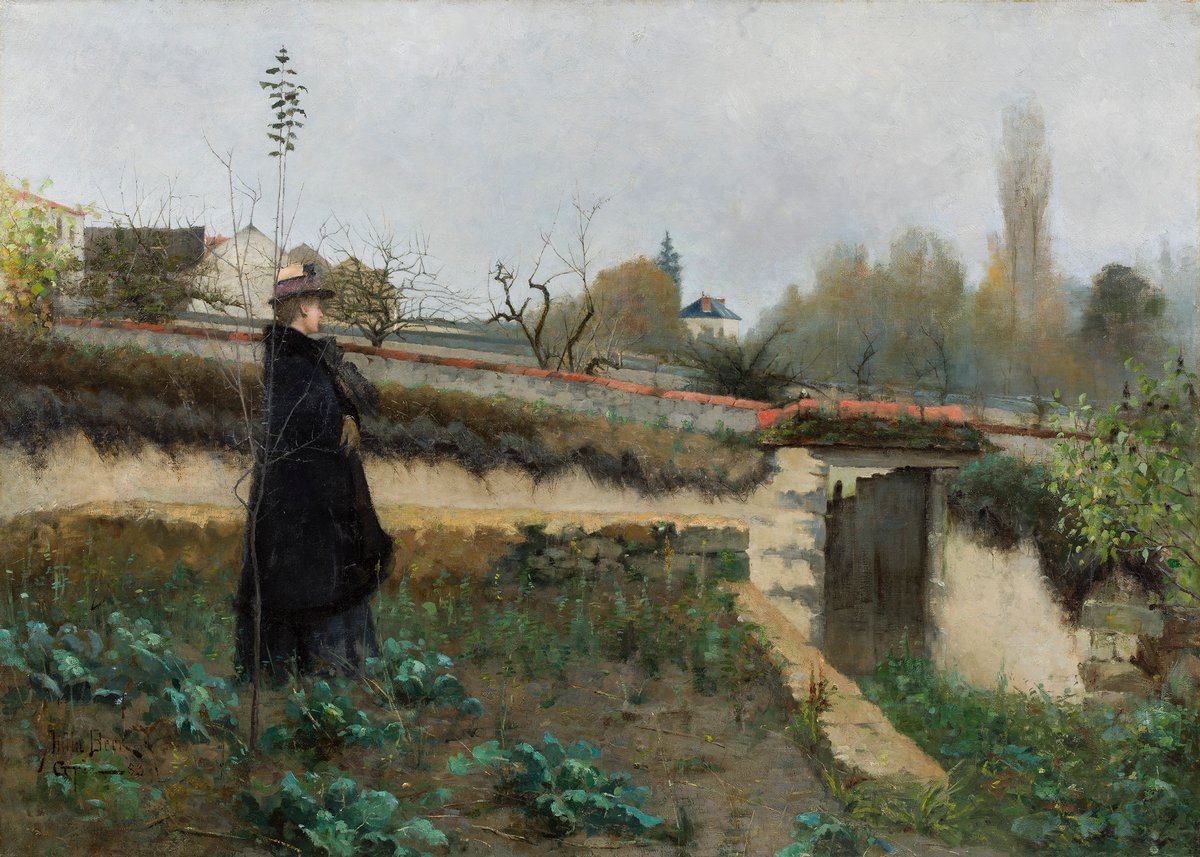 Julia Beck, Höstdag, Sign. 1883, Olja på duk (t.v) — Interiör från utställningen (t.h.)