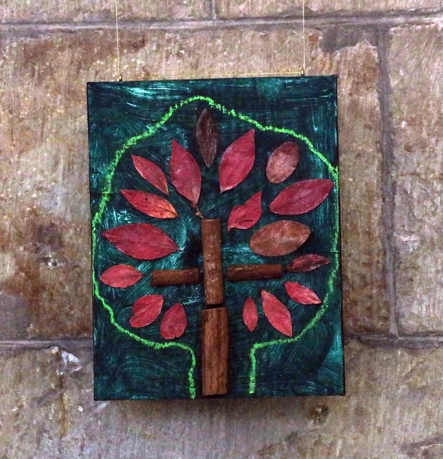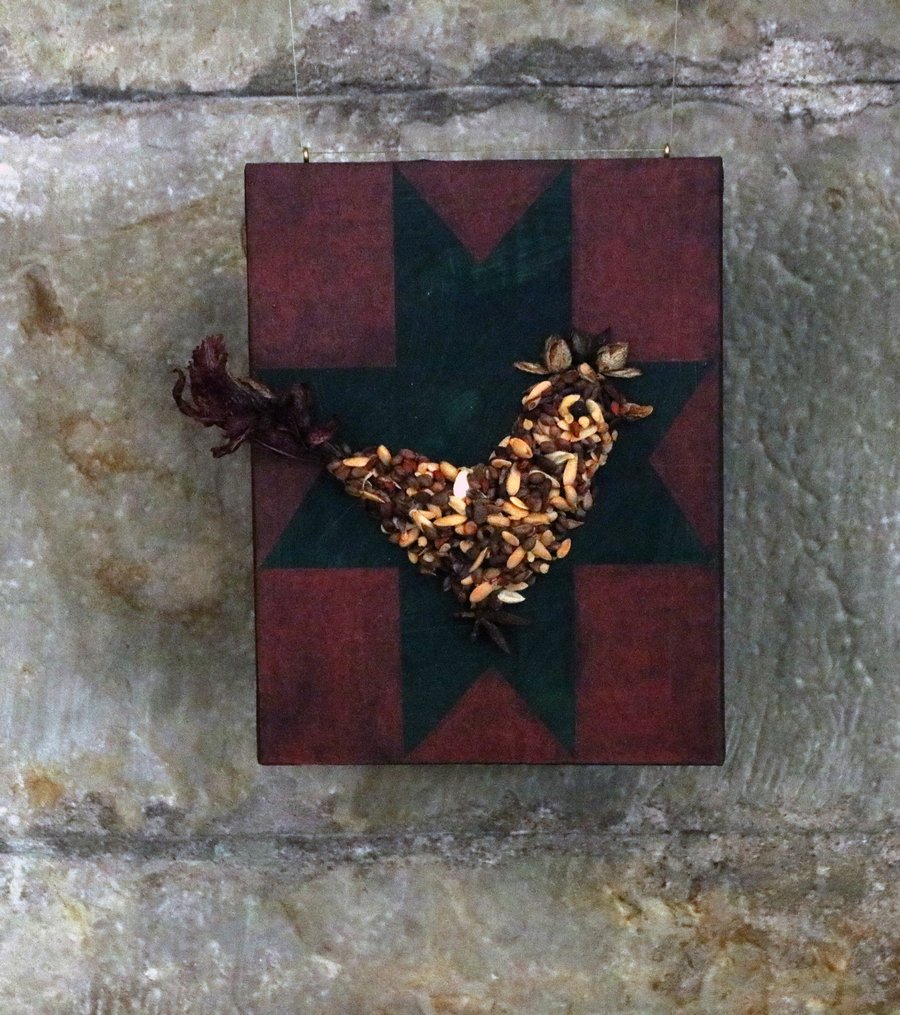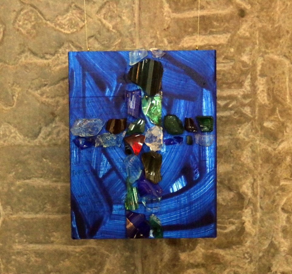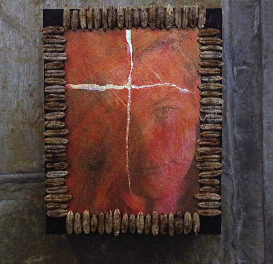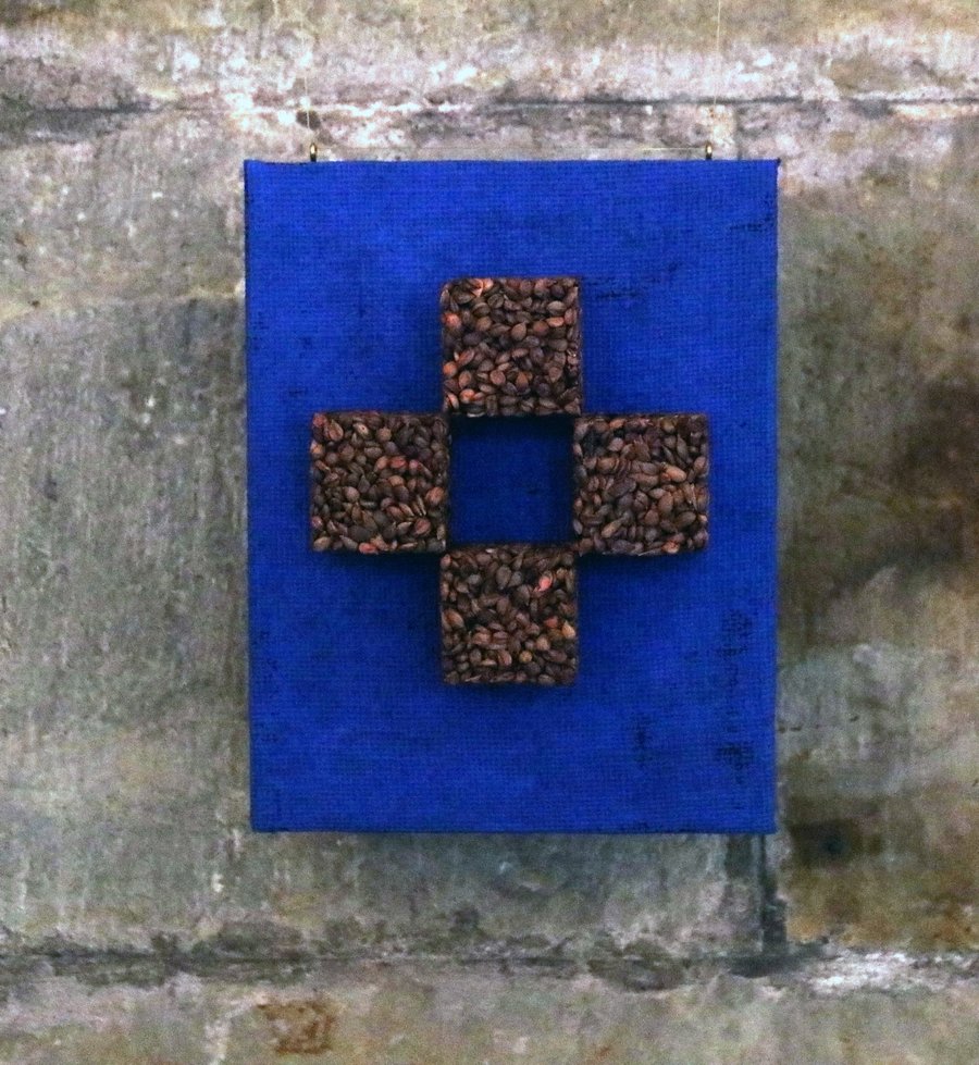 Korset är en form som kommer igen i bilderna. Det är varierat på många sätt. Ofta gör Tommy Westberg sina bilder av enkla material, det kan vara fruktkärnor. Det gör dem reliefartade med en livfull yta. Dessa frön ser jag som symboler för växtkraft. Man kan också se användandet av dem som en gest mot en folkligare religion där tanken och enkelheten får ersätta guldet. Jag tycker om den intimitet och närhet det skapar. Här finns känslig blandning av måleri och fotografi. Och ett verk med färgade glasbitar. Alla är gjorda med varlig eftertanke i materialbehandling och framför allt i konstnärligt uttryck. Lågmäldheten skärper sinnen och uppmärksamhet. Det är alltid i det lilla det stora ger sig till känna.