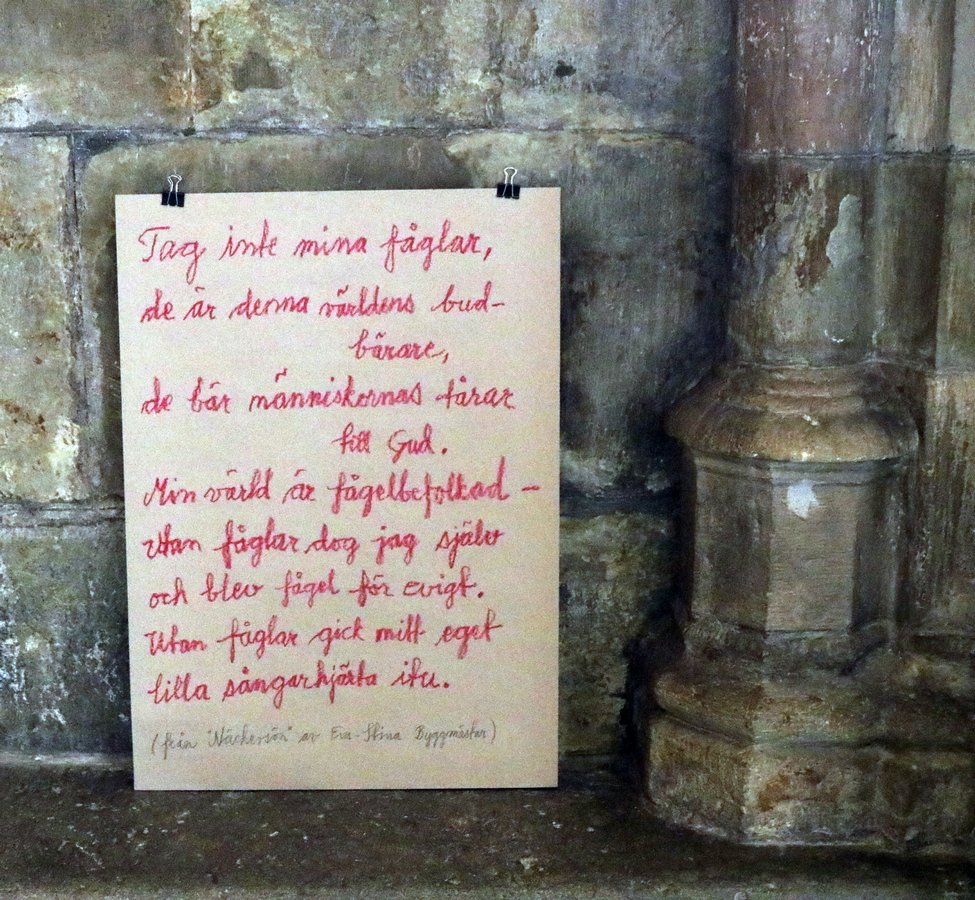 Bilderna är gjorda med stor omsorg och estetisk försyn. Här handlar det, som jag ser det, om att levandegöra tradition och symboler och ge nya aspekter i mötet med personlig konstnärlig gestaltning och viktiga ord. Han har skrivit ner citat av poeter som Karin Boye, Hjalmar Gullberg, Eva – Stina Byggmäster och andra. Vi får möta deras ord, men ibland också deras ansikten. Tradition, möter konst, möter människa, möter ord på ett sätt man sällan ser.