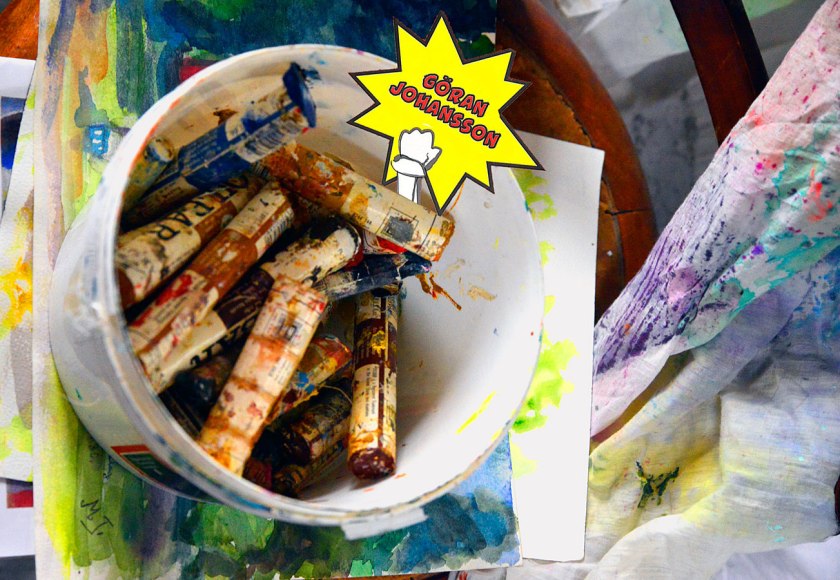 Gul pall med kanna (som firar Valborg), färg olja/akryl på pannå, 95 x 60 cm, 2018 – 2023
