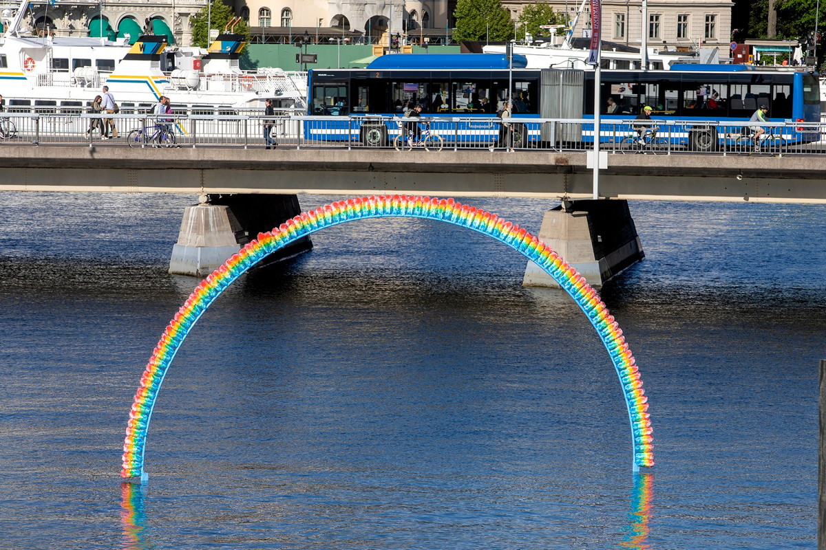 Konstnären Filippa Nilsson Kallheds regnbåge bestående av färgglada, fluffiga dammvippor på en metallbåge, tio meter i diameter, monterades av fyra orangeklädda män i Norrström på måndagsförmiddagen.