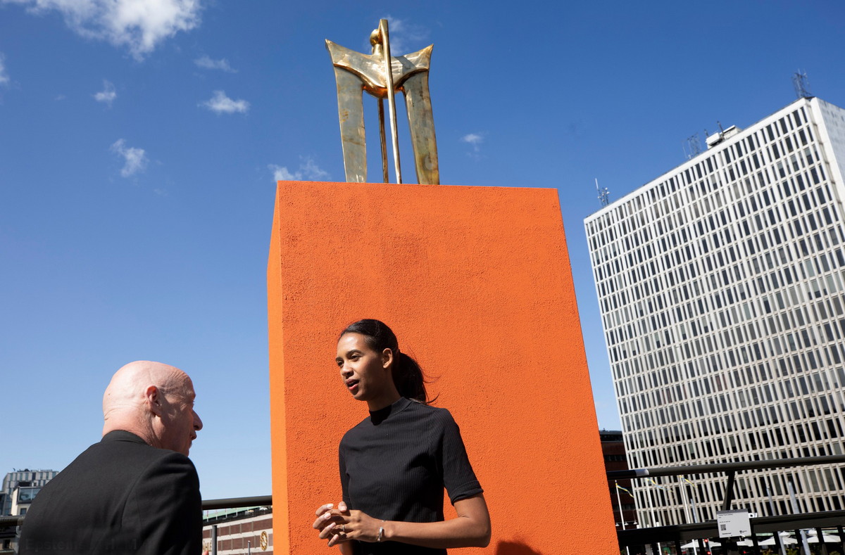 Konstnären Theresa Traore Dahlbergs fantasifågel Idrix med två näbbar i glänsande brons på en orange piedestal är ett av bidragen i Stockholm Konsts traditionella sommarutställning som pågår till den 12 september 2023.