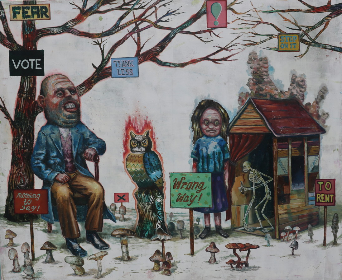 Bildspråket är tillgängligt i sina delar men helheten ställer krav på oss. För det är ingen tvekan om att det finns något bakom väggar och murar och innanför personernas personor. Ibland pyser det ut som en kodad rök eller färgsprakande tomtebloss. Andra gånger som ett nödrop i en pratbubbla i målningen. En märker det inte först, ungefär som en inte ser skogen för träden. Men så befinner sig plötsligt det underliggande överst. En hel armé av funderingar, passioner, skräck och förvirring stormar emot oss vilket vi vill eller inte.