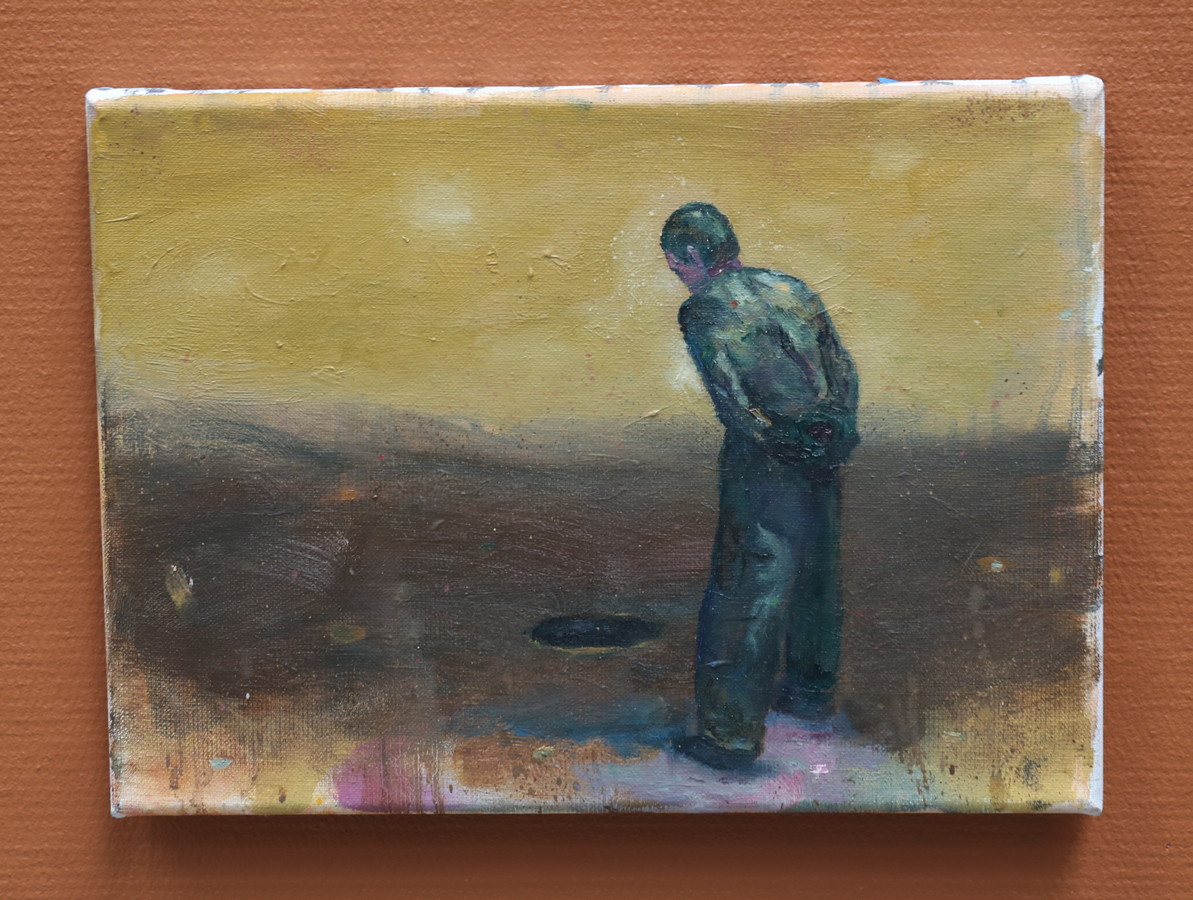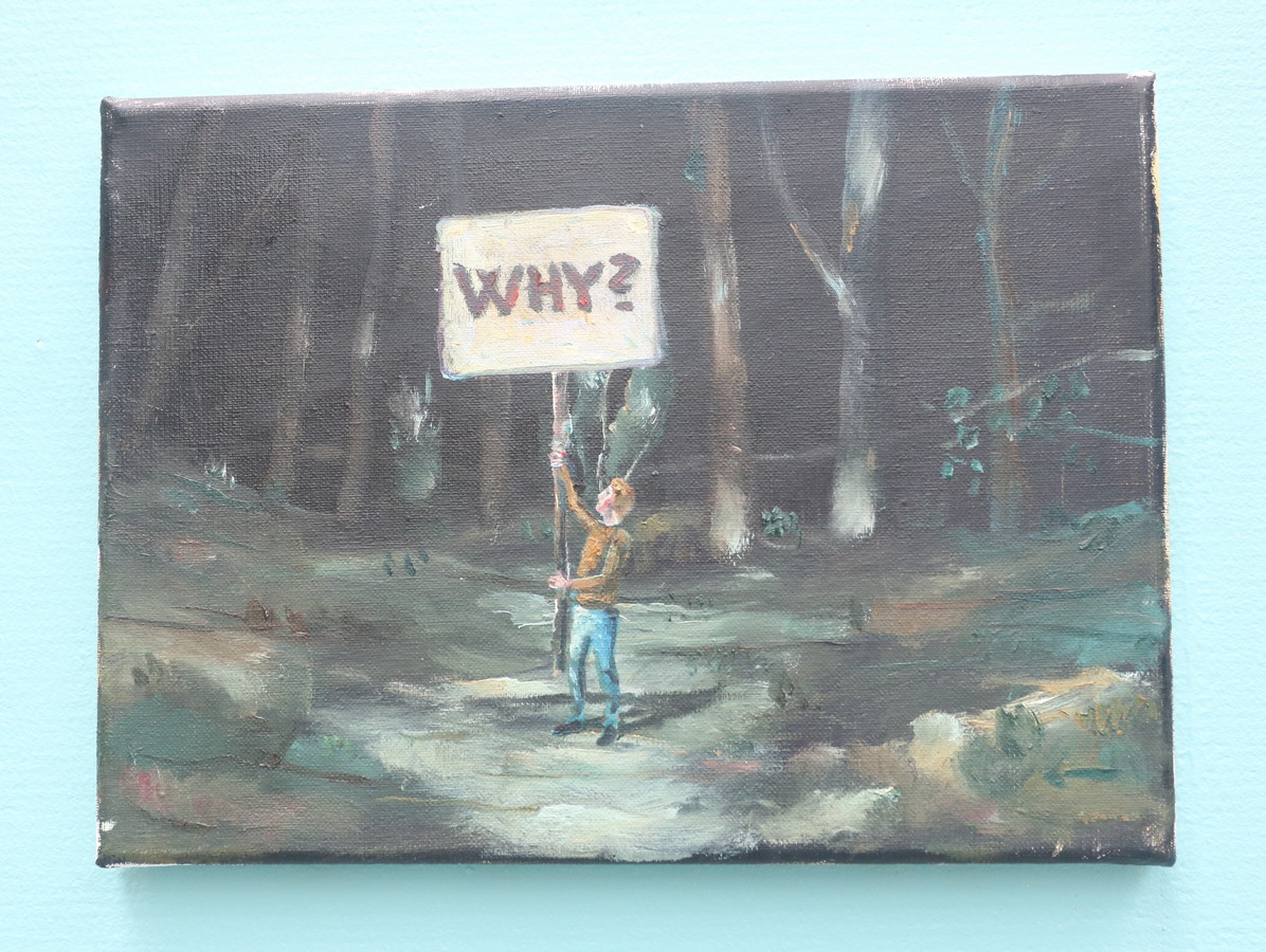 På en målning står en Olle i en mörk storskog med en skylt med texten WHY? lutad snett uppåt. I en annan ligger en man drunknande och pekar uppåt mot himlen med samma outsagda fråga. I en tredje står han i uppgiven kroppshållning och tittar ned i ett mörkt slukhål. Stora frågor. Inga svar. Åtminstone inte sådana vi vill ha.
