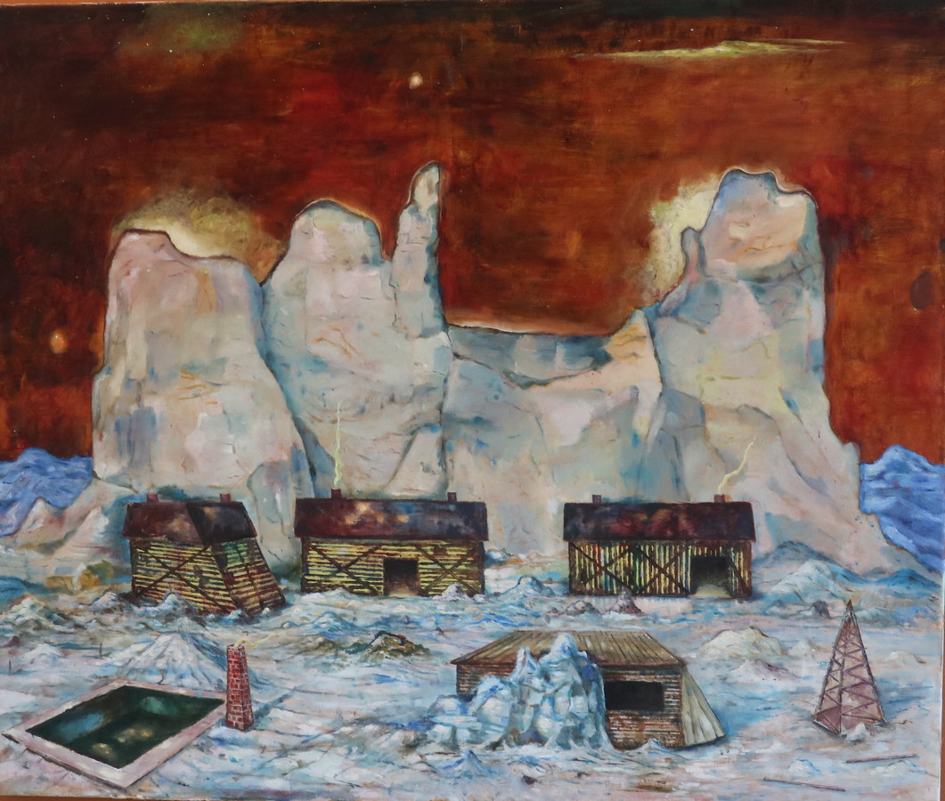 I en målning ses ett stort isberg i fonden starkt belyst av obehagligt obönhörlig smältvärme. Och framför det några av industrisamhällets symboler som en fabriksskorsten och ett oljeborrtorn. Och tillsynes övergivna hus. Så ser en att isberget har drag av ösiluetten i Böcklins älskade senromantiska målning Dödens ö. Men här finns inget mörker att melankoliskt försjunka i. Det handlar om en annan tid. Vår tid. Olle Schmidts målning är laddad med den kalla klimatångest det smältande isberget kan symbolisera.