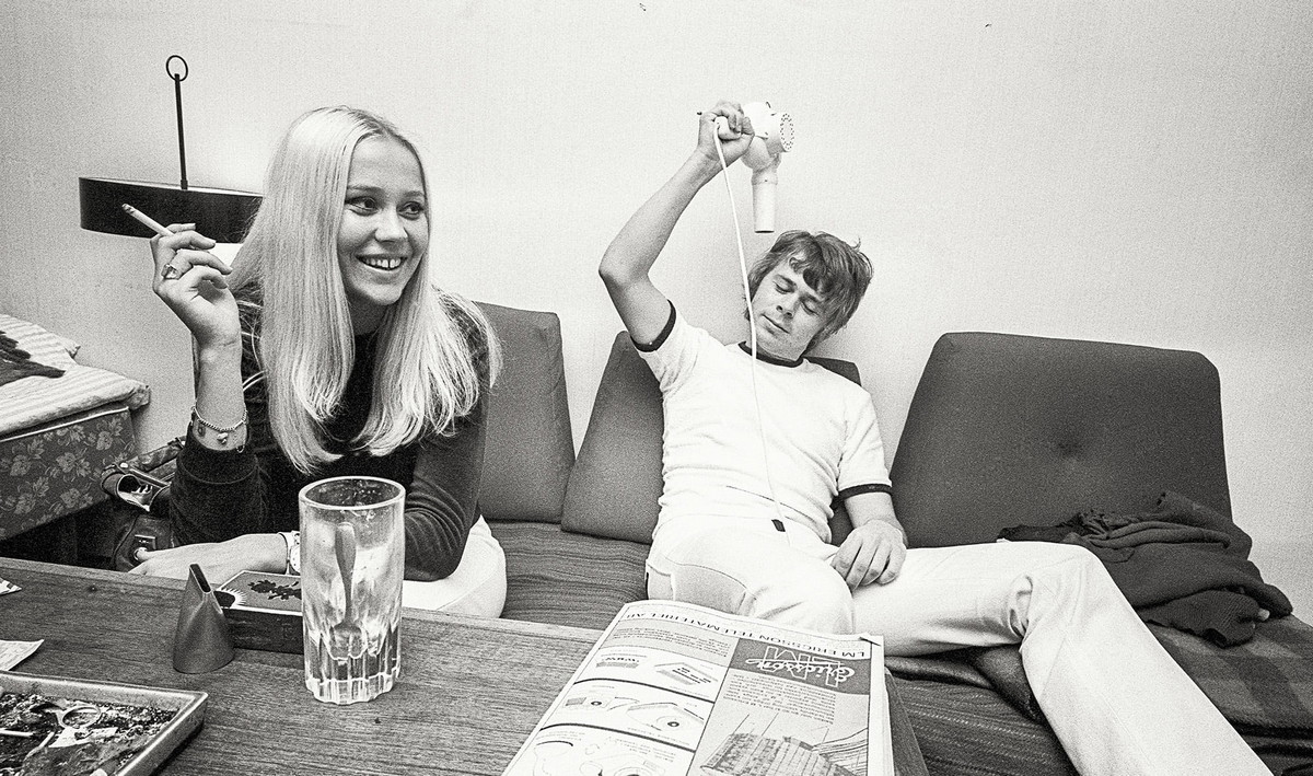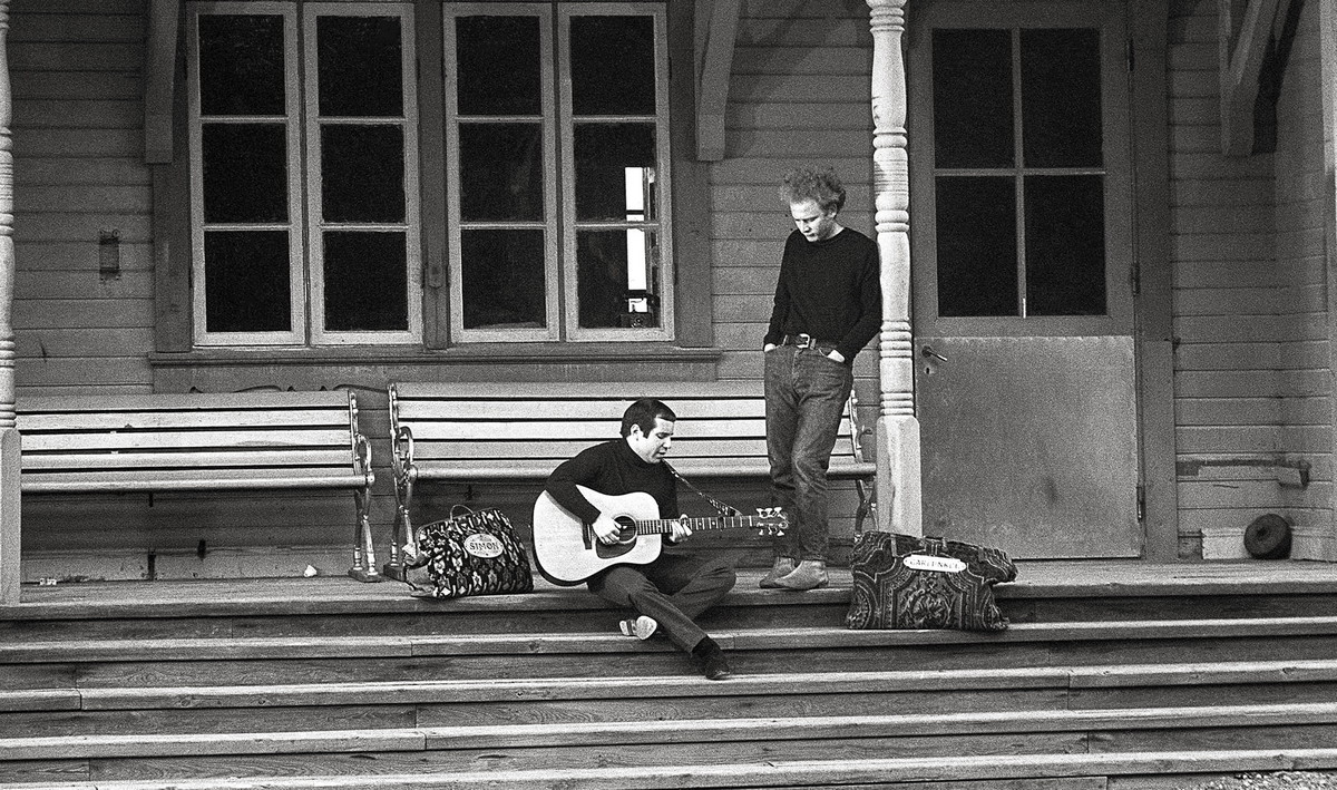 Agnetha Fältskog och Björn Ulvaeus hemma i lägenheten på Kungsholms strand 1969 (t.v.) — Simon and Garfunkel i Mariefreds stationsbyggnad för teveinspelning 1966 (t.h.)