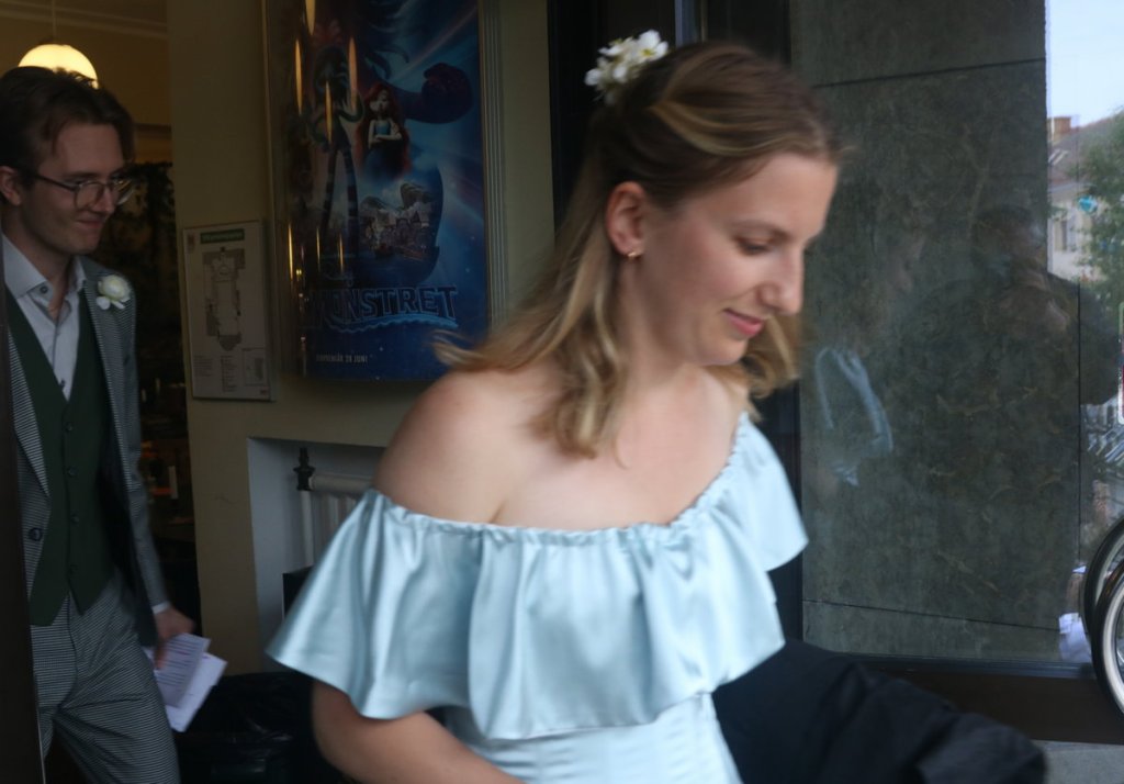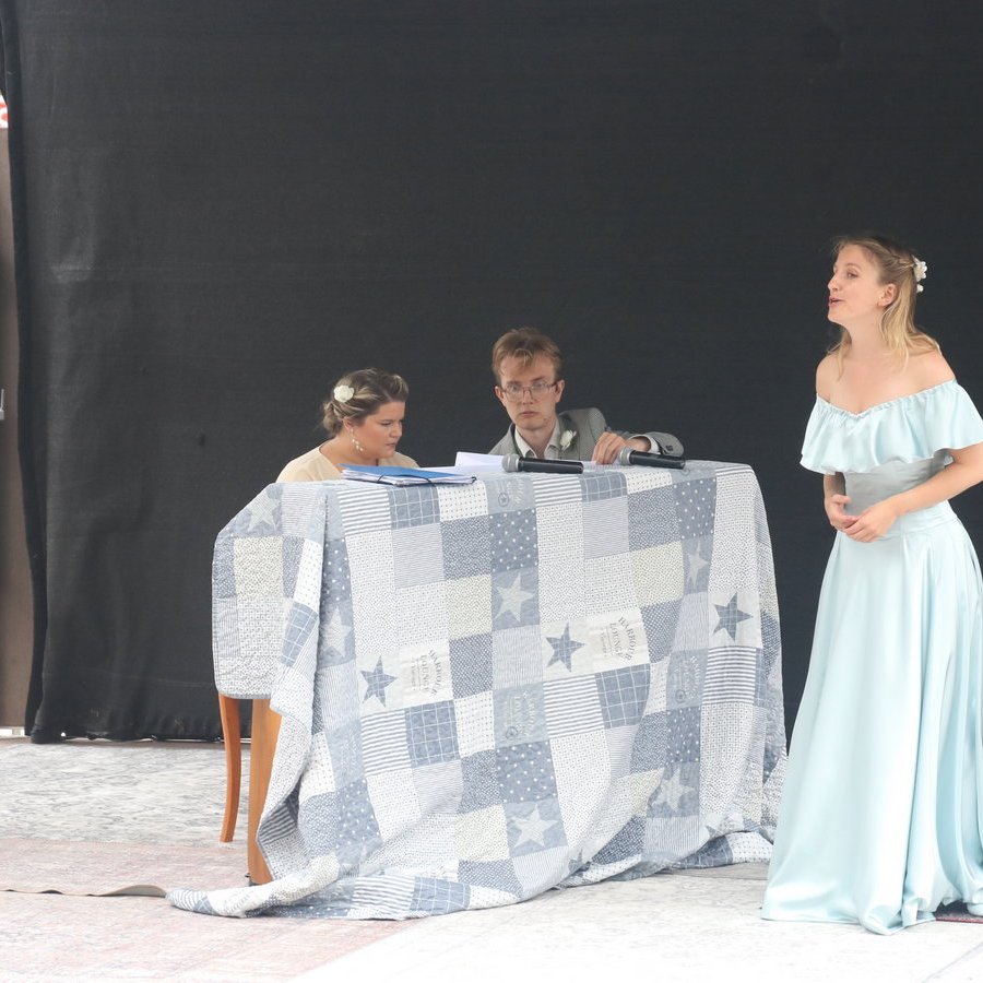Utanför Folkets hus entré finns en uteservering. Och framför den hade man placerat en jättestor täckt mobil scen, med nystämt piano, mickar och till och med ett par fåtöljer. Det visade sig vara en utmärkt arena för en sommarkonsert med de tre unga musikerna. Ett drygt femtiotal hade samlats för att lyssna. Det började regna under konserten, men det hindrade varken artister eller publik.