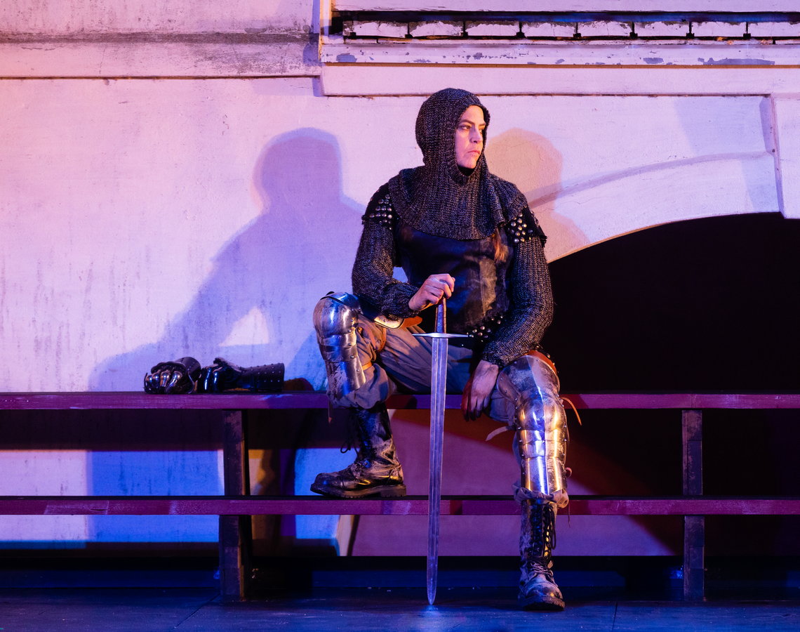 Sigrid Vetleseter Bøe som Lady Macbeth — John Kinell, Martin Lissel, Fabian Düberg samt Petter Reingardt som lönnmördare (t.v.) — Lars Johansson Brissman samt John Kinell som Macbeth och hans tjänare (t.h.)