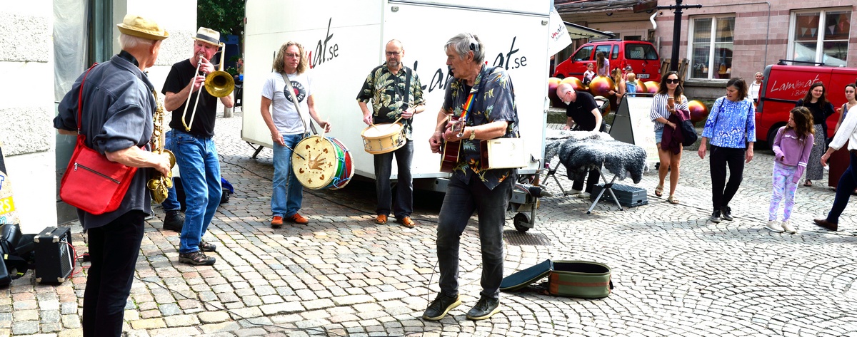 Färden fortsatte mot Haga och folklivet där. ”Bondens marknad” snett utanför Galleri PS drog igång sin underhållning med musik. Kryssade mig genom musikerleden och in på PS.