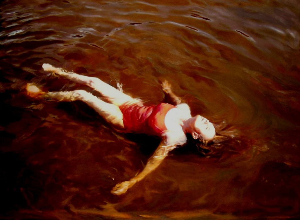 En fin målning som visar Karin Broos konst när den är som bäst är i mina ögon Flytande 3 från 2021. Man minns prerafaeliterna. Men framför allt är det bilden av en kvinna som är här i nuet, i vår värld, men ändå i sin egen.