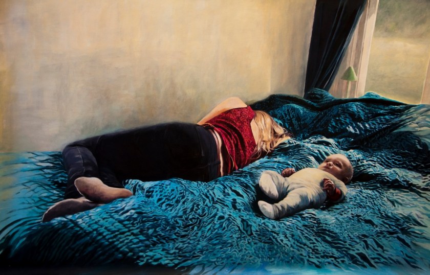 Några har jag svårare för, som det stora blå från 2010. Jag tycker mycket om skildringen av den sovande modern och barnet. Men det där blå överkastet som är ett mellanting mellan textil och vatten, det är bara för mycket. Jag blir sjösjuk av alla krusiga veck och gissar att det är troheten mot ett fotos blick som gör bilden så underlig.