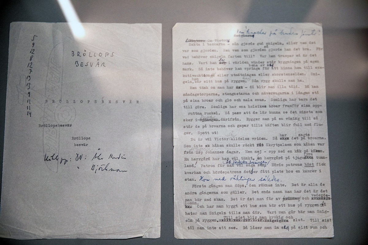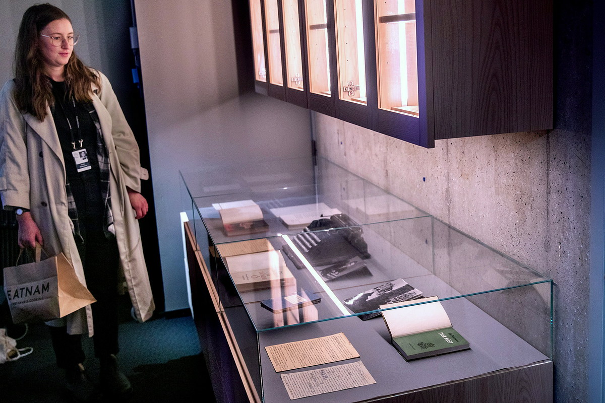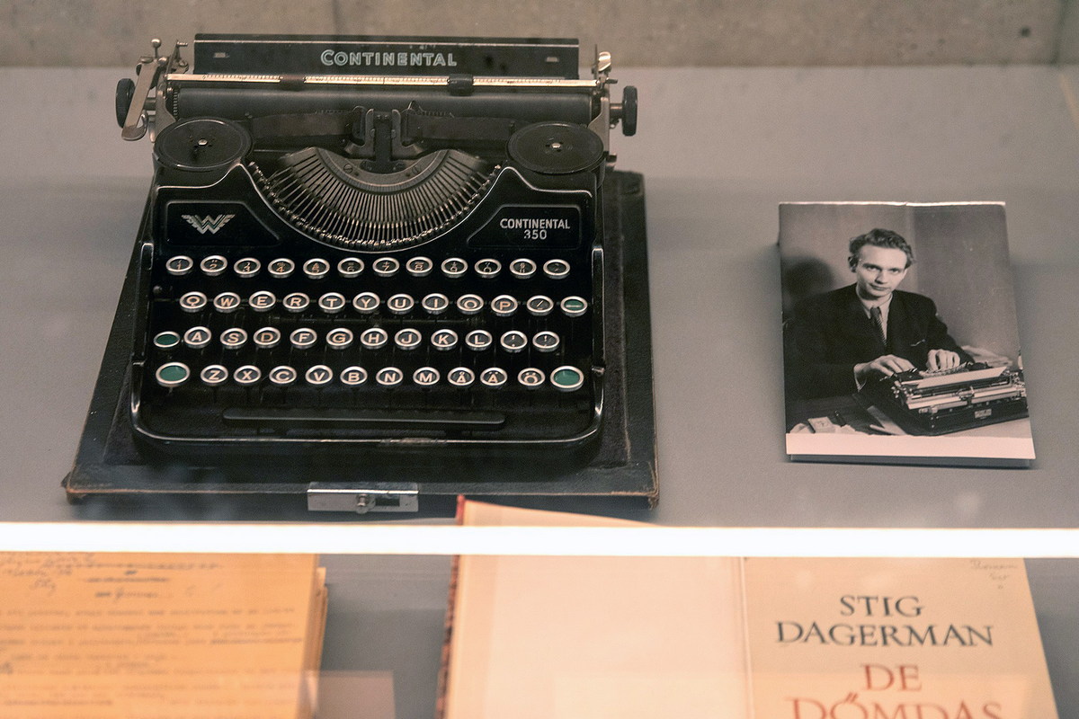 I samma ögonblick öppnades dörren till Kungliga bibliotekets visningsrum på plan tre i annexet för den blott fem timmar långa utställningen med originalmanuskript, originalutgåvor, originalskrivmaskin, fotografier och annat tillhörande Stig Dagermans (1923 – 1954) författarskap.