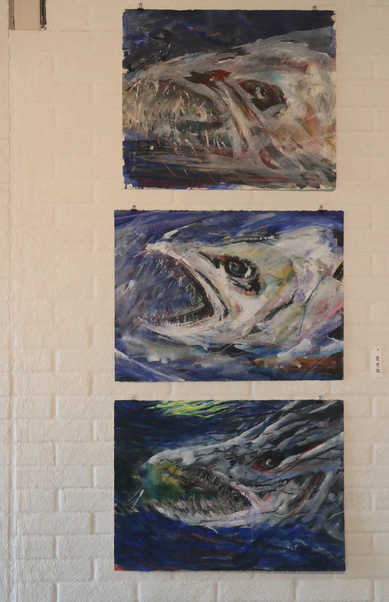 Den här utställningen fortsätter med olika stationer ute i Vänermuseets basutställning. Han har suttit där en tid och målat akvarell med fiskarna i akvarierna som motiv. Det märks att han har trivts med det. Nu sitter en grupp sådana bilder över ett akvarium. Det har blivit lätta, fräscha akvareller med akvariefiskar i olika belägenheter. I en ser man konstnären själv i arbete sammansmält med sitt motiv i en dubbelexponering i akvarieglaset med de fiskar han studerar.