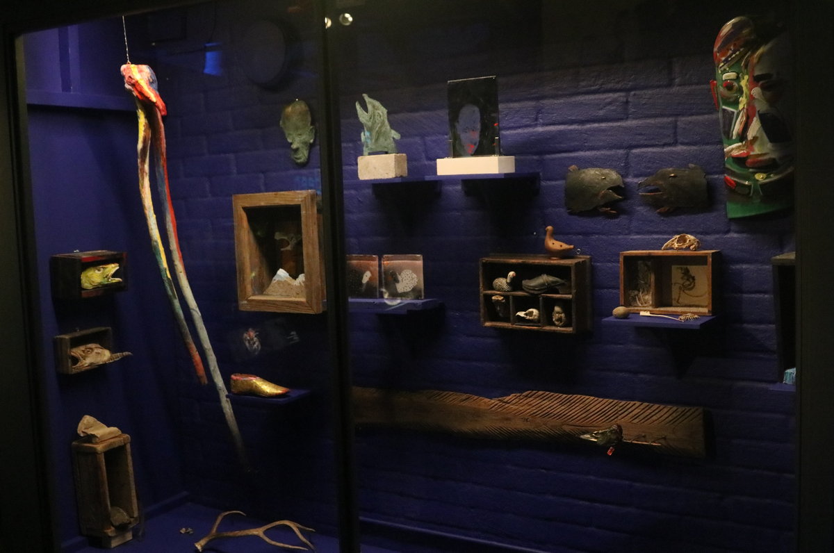 På andra ställen ser man föremål med fiskanknytning han gestaltat genom åren. Och ett fint självporträtt i brons. Man kan också se en monter med skissböcker och en modell till hans utsmyckning i Hällekis hamn. Ett stiliserat fiskhuvud (förstås) i emalj.