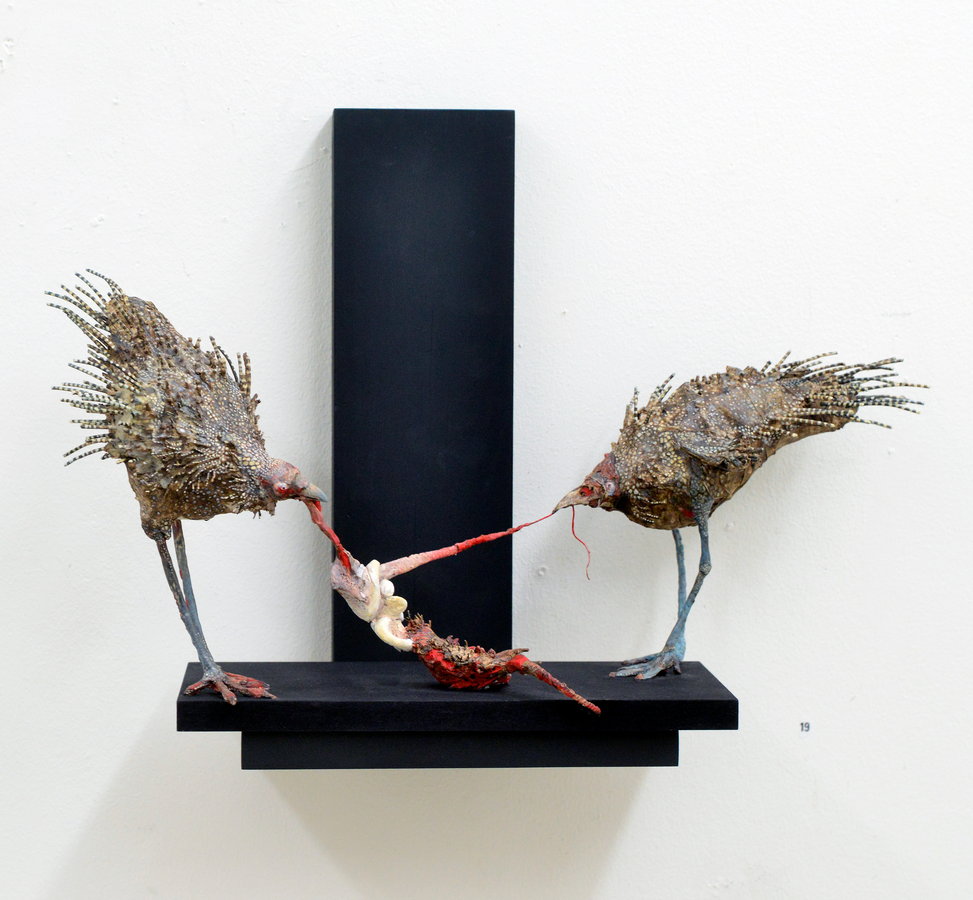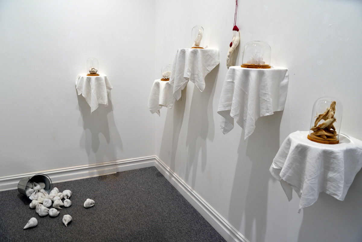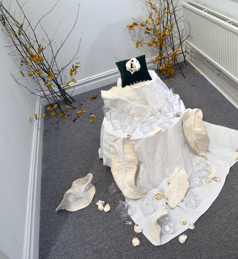 I ett långt studerande av Vanitasmåleri och mat-stilleben undersöker hon skulpturernas relation till varandra och till rummet.