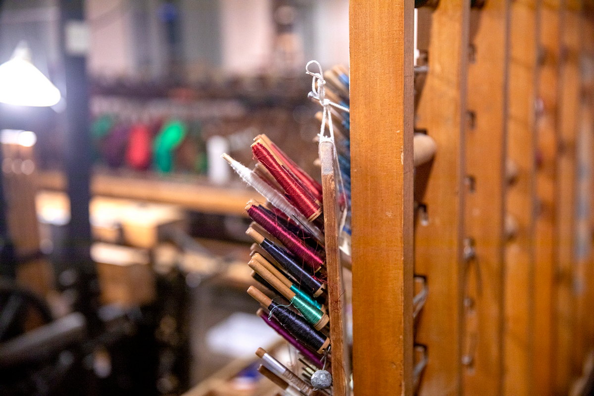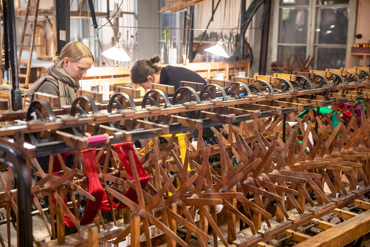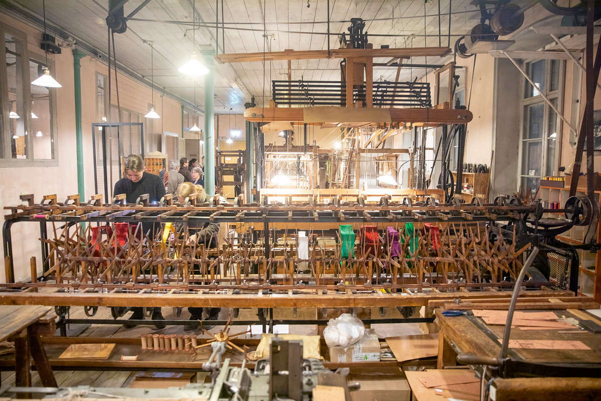 Några lärlingar demonstrerade sidenväveriet och dess urgamla maskiner, som är i fullt bruk, fungerar
