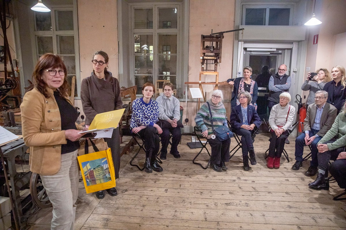 Erika Grann (t.v.) från ArbetSam delar ut priset till K.A. Almgrens sidenväveri & museums verksamhetschef Anna Hedtjärn Wester —- Ordföranden i juryn Hanna Törnqvist från Arbetets museum i Norrköping berättade om varför just Almgrens fick det i år. Priset har utdelats varje år sedan 2010