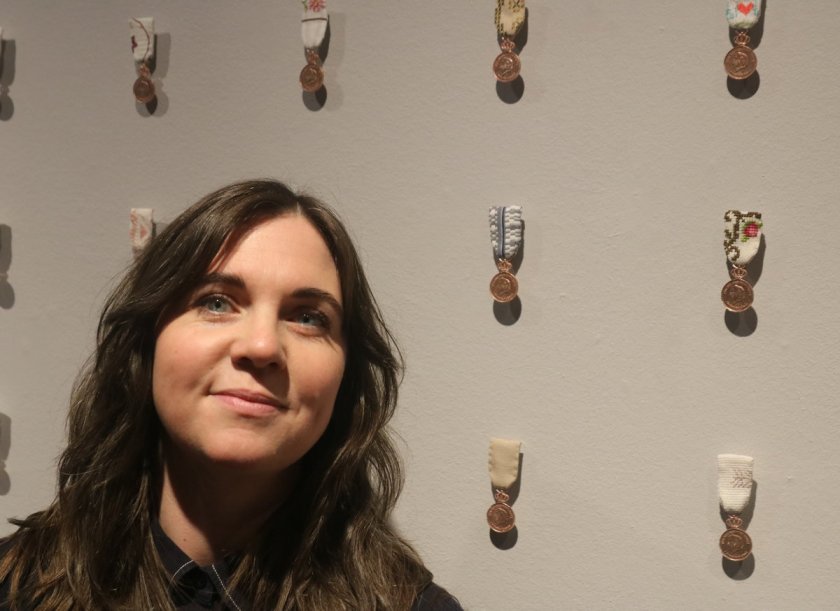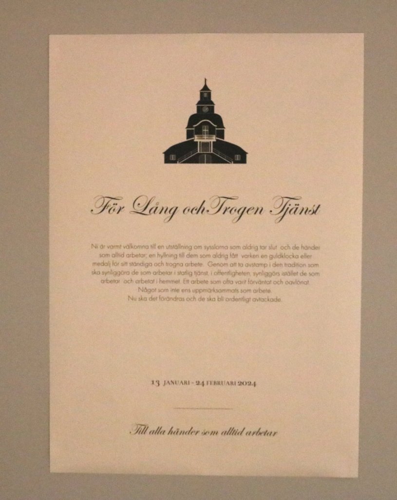 Så hon ger de okända hemmakonstnärerna medaljer för lång och trogen tjänst. På en vägg i utställningen hänger 252 medaljer. De är gjorda som en hyllning till personer som människor tyckt behövde hyllas för det de gjort. Deras namn projiceras som en sekvens på en vägg. På en annan hänger medaljerna. Medaljbanden är bitar av folkliga textilier som Emelie Liljebäck fållat upp fint. På Medaljens åtsida finns bilden av en av de kvinnor som handarbetat långt ifrån offentligheten, men vars arbeten prytt och gjort hemmet trevligare. Runt hennes bild står utmärkelseorden; För nit och redlighet i rikets tjänst. På reversen ståt det; Till alla händer som alltid arbetar. En medalj till var och en av de nominerade. I utställningen finns också en stor jättestor medalj med en blank kopparskiva. Där kan du spegla in din egen bild.