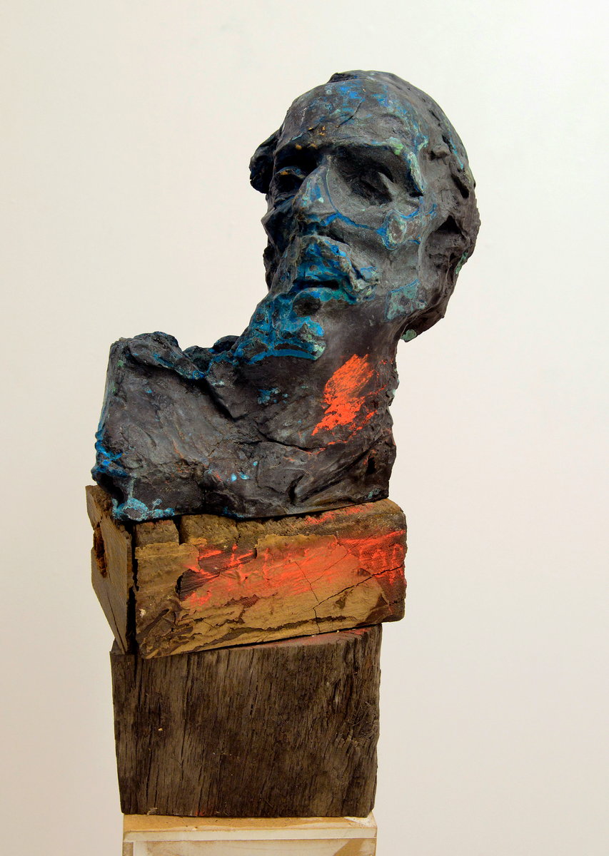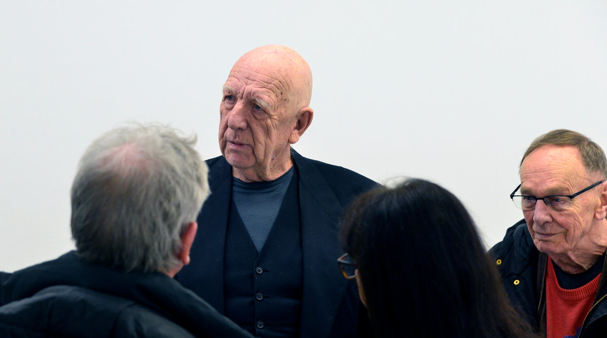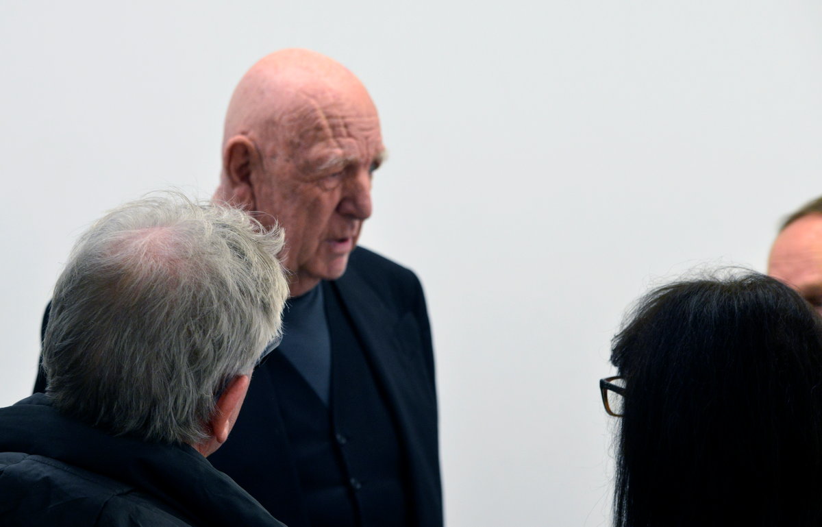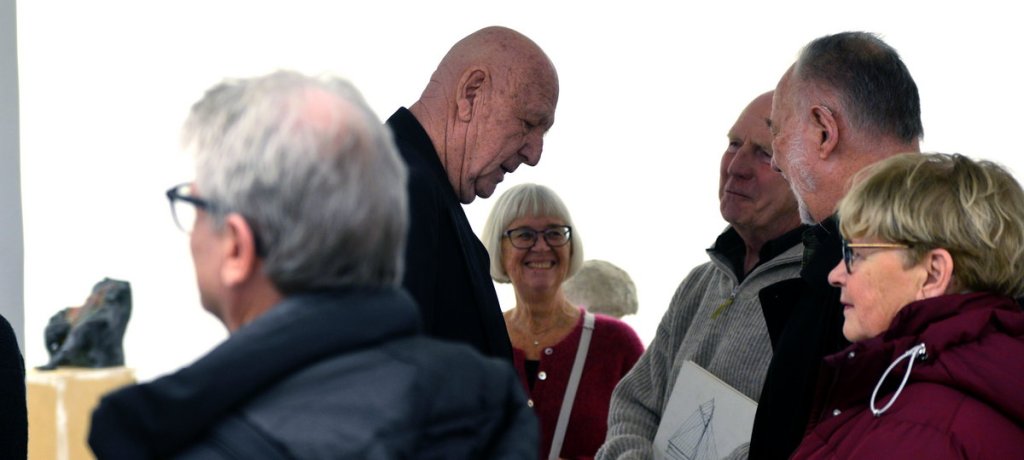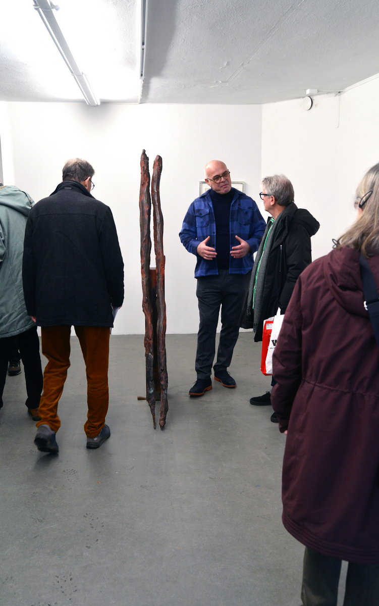 På vernissagedagen var det trångt i galleriet. Allt annat hade varit mycket underligt. Många ville tala med konstnären. Tur är att konstnären är huvudet högre än de flesta andra, så det var lätt att se var han befannn sig.