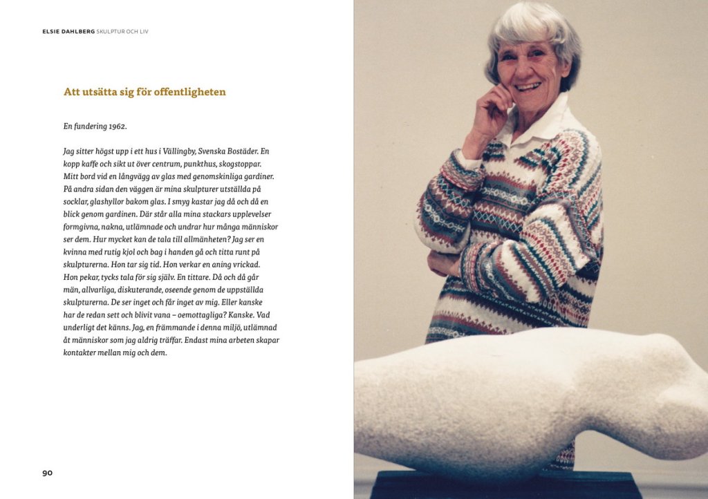 Boken om konstnären Elsie Dahlbergs liv och konst blir på många sätt en tidsresa. Omslaget slår an tonen. Det är ett svartvitt foto av hennes skulptur Lena från 1962. Det är en fin skulptur, en bild av en ung kvinna. Jag ser den som en kombination av stiliserat porträtt och en mera allmän gestaltning av begreppet ungdom. Formspråket är föreställande i en klassicerande stil. Det syns att den är gjord med största omsorg och eftertanke. Den är lugn och vilsam, kontaktsökande på ett jämbördigt sätt.