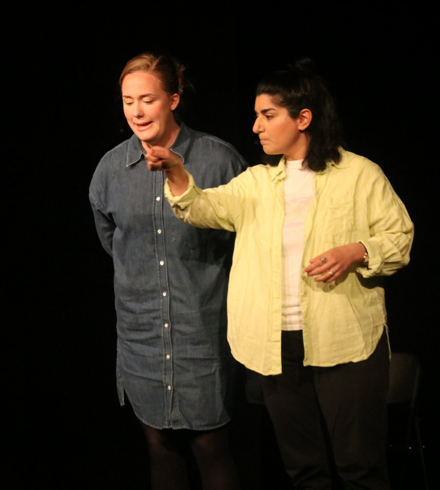 De fysiska förutsättningarna var enklast tänkbara. Ingen scenografi. Inga särskilda scenkläder. Enkelt fast ljus på scenen. De hade markerat spelplatsen med en fyrkant av gul tejp. När de var innanför den pågick spelet. När de gick utanför den lämnade de sina roller och kom strax tillbaka in som en annan. Ibland bytte de roller med varandra.