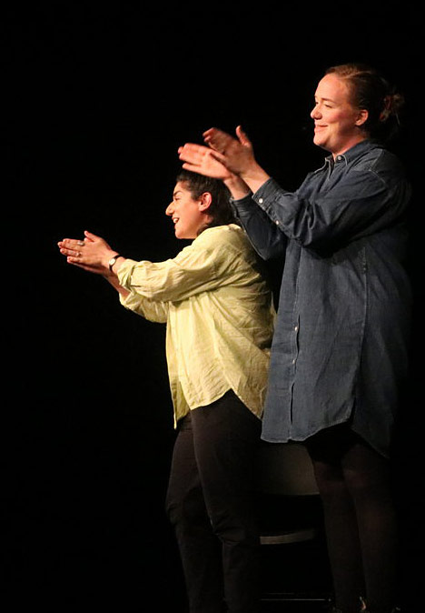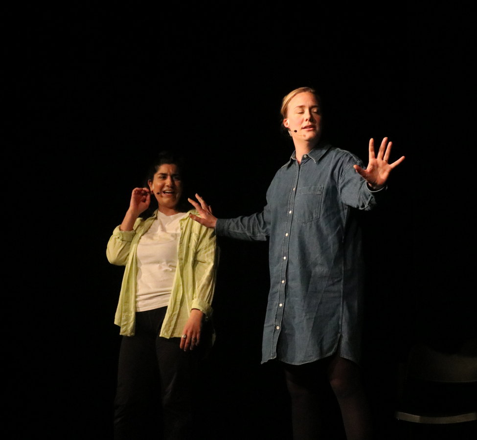 Det var inledningsvis mörkt i salongen. Men Dilan och Moa beordrade ljus på publiken. För i början skulle vi vara särskilt aktiva. De ställde frågor om Lidköping. Och ur den kökkenmödding av röster som blev svaren när vi svarade alla på en gång lyckades de vaska ut några guldägg med folksagepoential. Det var (förstås) maskarna i badhuset, pengarna i kommunen och annat smått och gott som räckte och blev över som ingredienser i en folksaga för de här klyftiga sagotanterna visade det sig.