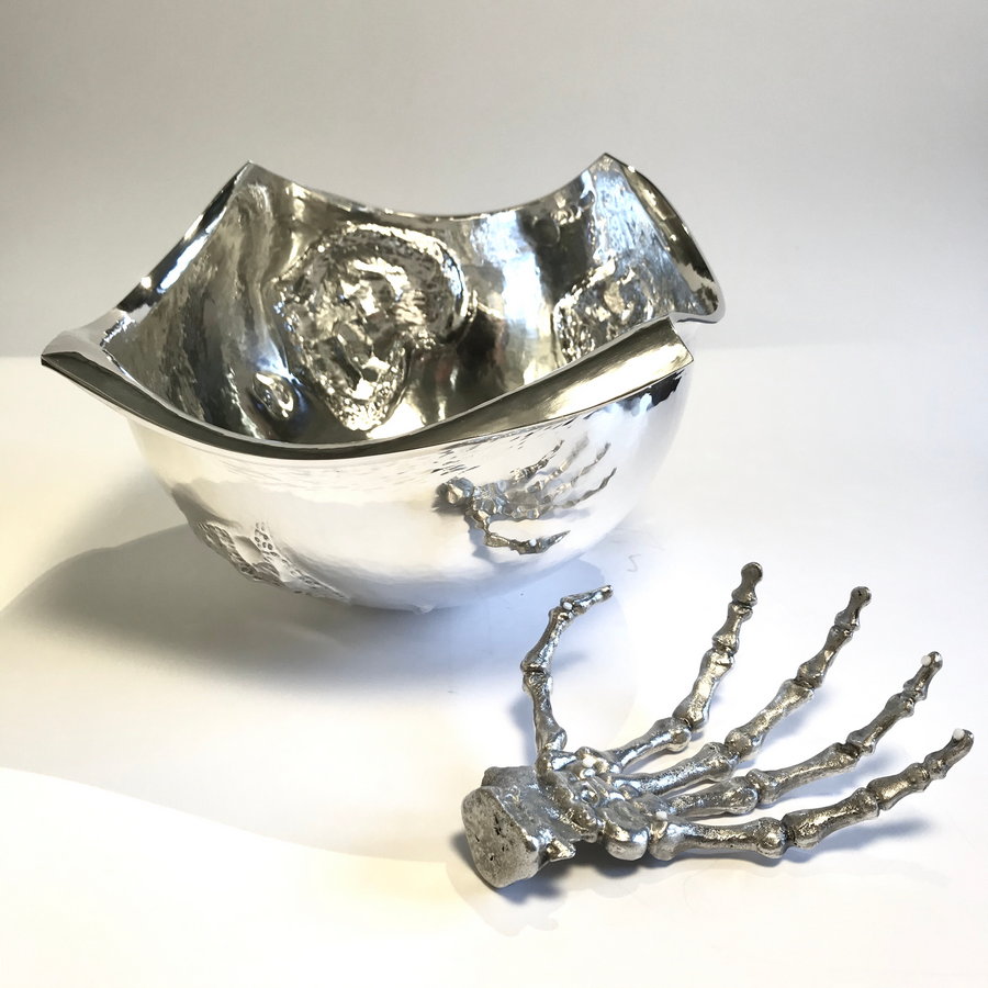 August Happ, La mano negra, skål och skeletthand i silver, 2020, Foto: Mona Fällberg (överst t.v.) — Pernilla Sylwan, Svartvit kanna, 2024, silver och svart glas, Foto: Petter Mörk (nederst t.v.) — Lars Arby, Krona i silver, Foto: Lars Edelholm (t.h.)