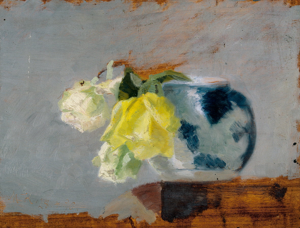 Marie Krøyer, Självporträtt, 1889, Foto: Skagens Kunstmuseer (t.v.) — Marie Krøyer, Rosor i blåmönstrad vas, 1890, Foto: Simon Lautrop (mitten ö.) Marie Krøyer, Solbelyst pergola från Ravello, 1890, Foto: Skagens Kunstmuseer (mitten n.) — Marie Krøyer, Kopia av äldre dekorerad allmogestol, Foto: Prins Eugens Waldemarsudde (t.h.)