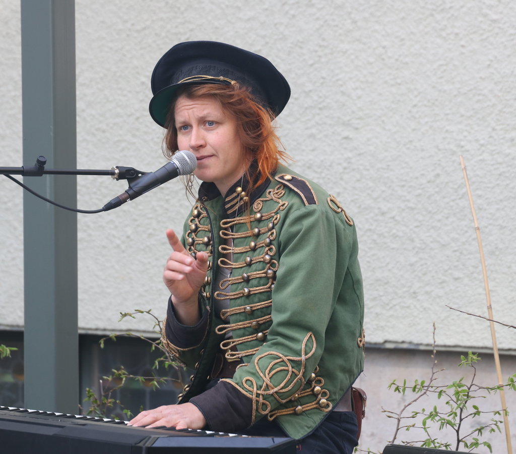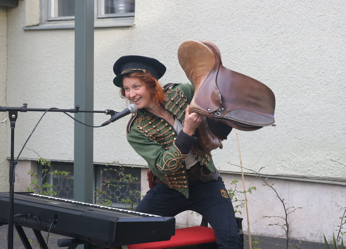 Hon vrider och vänder på perspektiven både bildligt och bokstavligt. Hon hade fyndat en ridsadel på second hand. På den satt hon när han växlade till elpiano för några låtar. Och det är klart att hon bjöd oss att provsitta.
