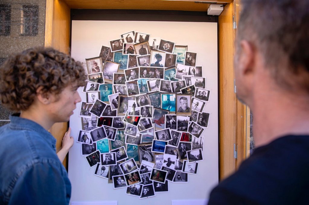 Ett spännande grepp med 99 små polaroidbilder i ett litet skyltskåp, tycker jag och börjar skärskåda den lilla utställningen när den är på plats.
