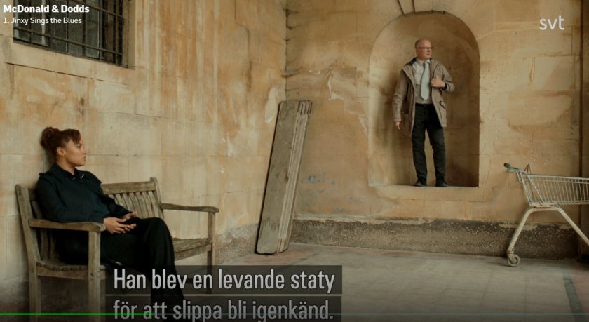 Ett exempel: Jag gjorde i min förra text en rätt stor poäng av Baths romerska arv och hur Dodds bleka hy och beige klädsel gick ton i ton med stadens kalkstensfasader. I första avsnittet av säsong fyra görs på nytt en visuell koppling mellan antiken och bleka britter. Dodds kliver upp i en nisch på en husfasad, ställer sig i klassisk kontraposto och inkarnerar för en stund en antik staty. Han blir en mindre heroisk version av de antika marmorvita gudarna.