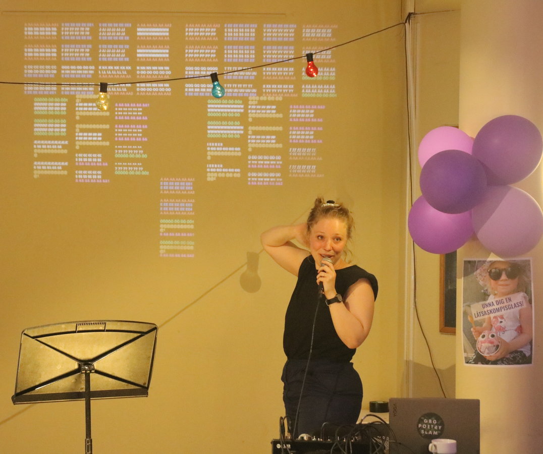 Men inte nog med det. Två av de tre inbokade poeterna (Aiman Jihar och Hanna Haag) mässfallade. En drabbades av sjukdom och en annan av SJ. Hoppas vi får möta dem vid ett annat tillfälle. Men kvällens sessionsledare poeten mm Olivia Bergdahl gick själv in med två pass som Olivia I och Oliva II och så fick vi fullt program ändå.