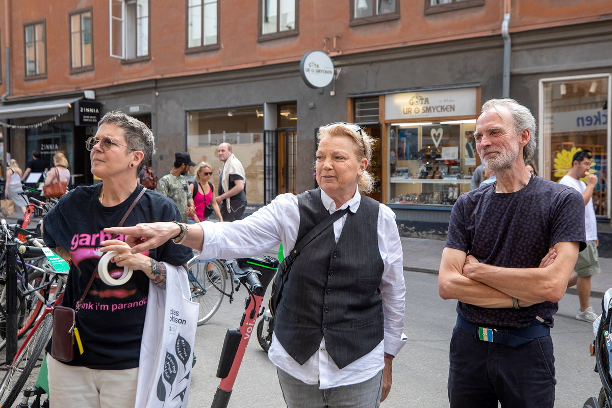 Det är också den första bilden hon börjar tejpa och nåla upp på fredagseftermiddagen i den lilla (men i ett annat avseende stora) utställningen i Galleriet Skåpets skyltskåp i Götgatsbacken intill Slussens tunnelbaneutgång vid Hökens gata.