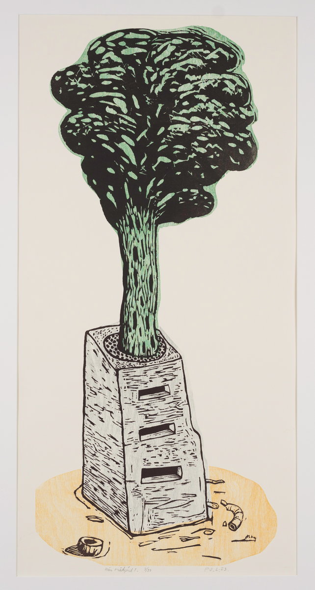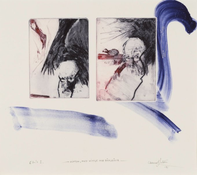 Lokalpatriot som jag är letar jag först reda på den enda skaraborgaren i årets utställning. Det är Chennet Juhlin en erfaren och driven bildmakare i olika tekniker. I bladet Med vinge och pärlhöna kombinerar han traditionella grafiska uttryck med mera måleritypiska. Det skapar en egen bildmässig dramatik.
