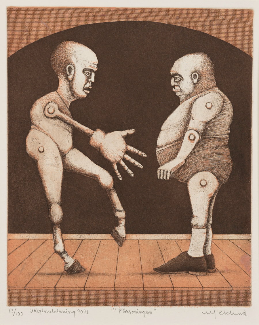 Ulf Eklunds Magnifika bild Försoningen lämnar en ingen ro. Den är hårt stiliserad och teatralisk på ett bra sätt. Han som i bilden sträcker ut sin hand är en man med hovar till fötter. I drömmen kan det symbolisera en kombination av intelligens och viljan att övervinna hinder. Men det finns en dubbelhet här, en tvetydighet som ger bilden en dialektisk puls.