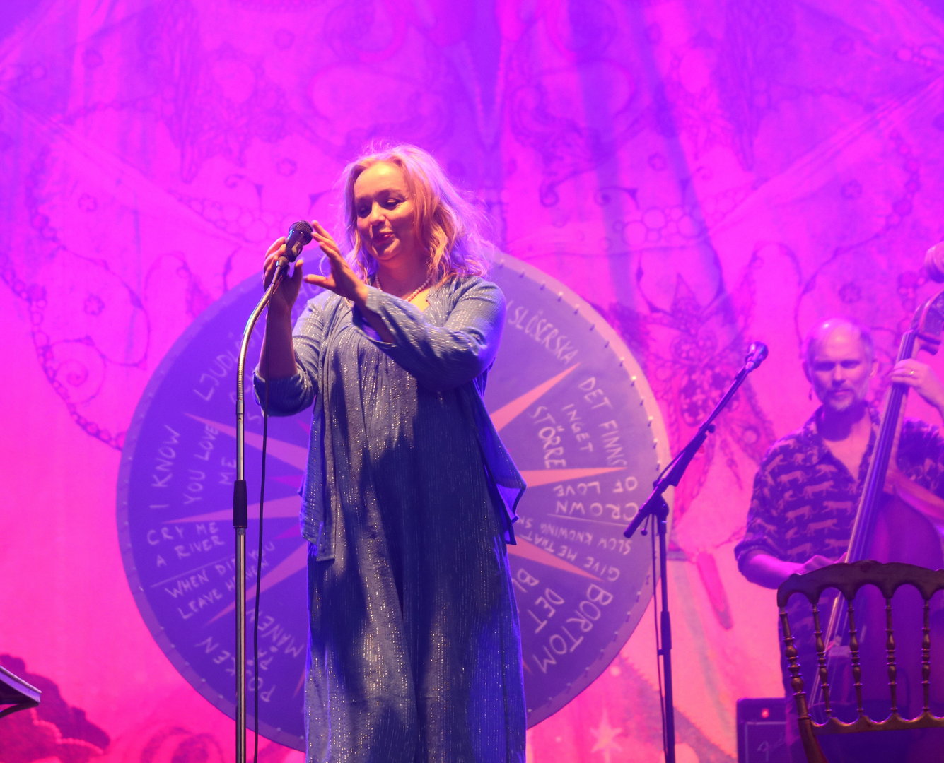 Det finns mycket gott att säga om scenartisten Lisa Ekdahl. Hon har en påtaglig scennärvaro och karisma. Hon babblar på om kärlek och längtan mellan låtarna. Det är litet hippiestämning och det förstärks av scenbilden. Hon berättar, som hon gjort så många gånger förr, om hur skivdebuten ändrade hennes liv och hur tacksam hon är för det.