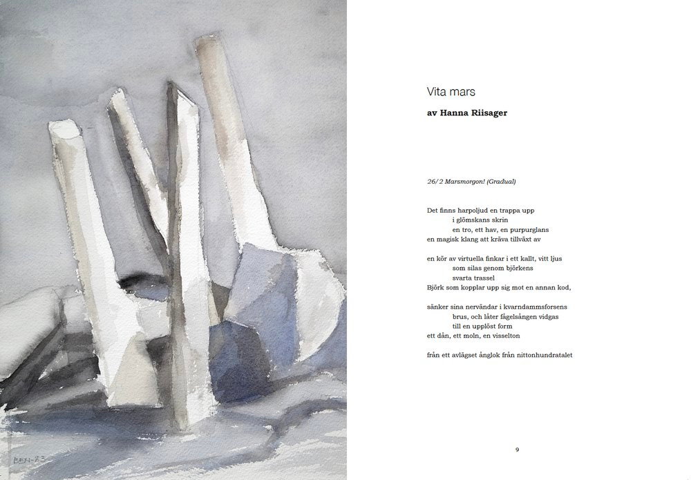 Den inleds med ett antal dikter av Hanna Riisager. Dikterna är tillkomna i vad som är hämtade ur ett pågående arbete ”…som delvis förhåller sig dialogiskt.” till Birger E. Nilssons (som är hennes farfar) dikter och texter. Dikterna är en speciell blandning av högstämd romantik (med ord som ”harpoljud” och ”purpurglans”) och dess möte med ”virtuella finkar” och björkar som ”kopplar upp sig”. Den dialogen så poetisk den är öppnar inte BENs verk för mig.