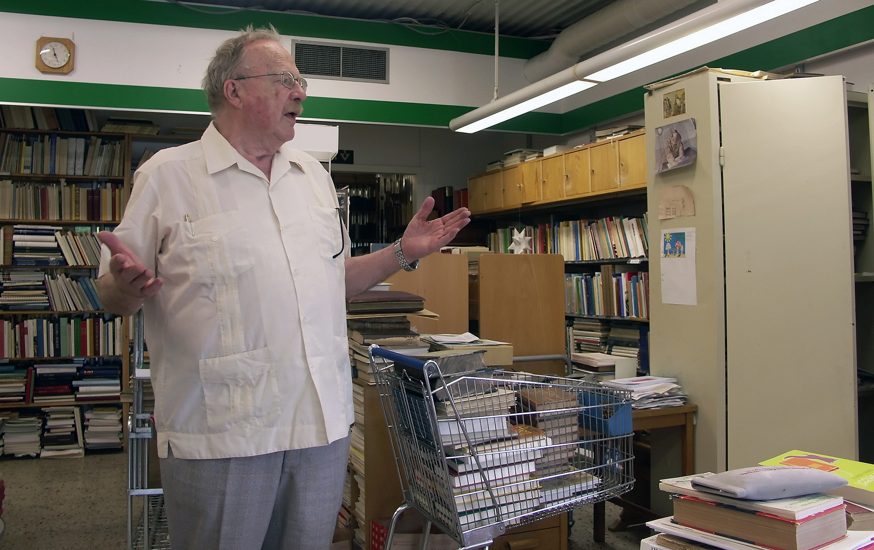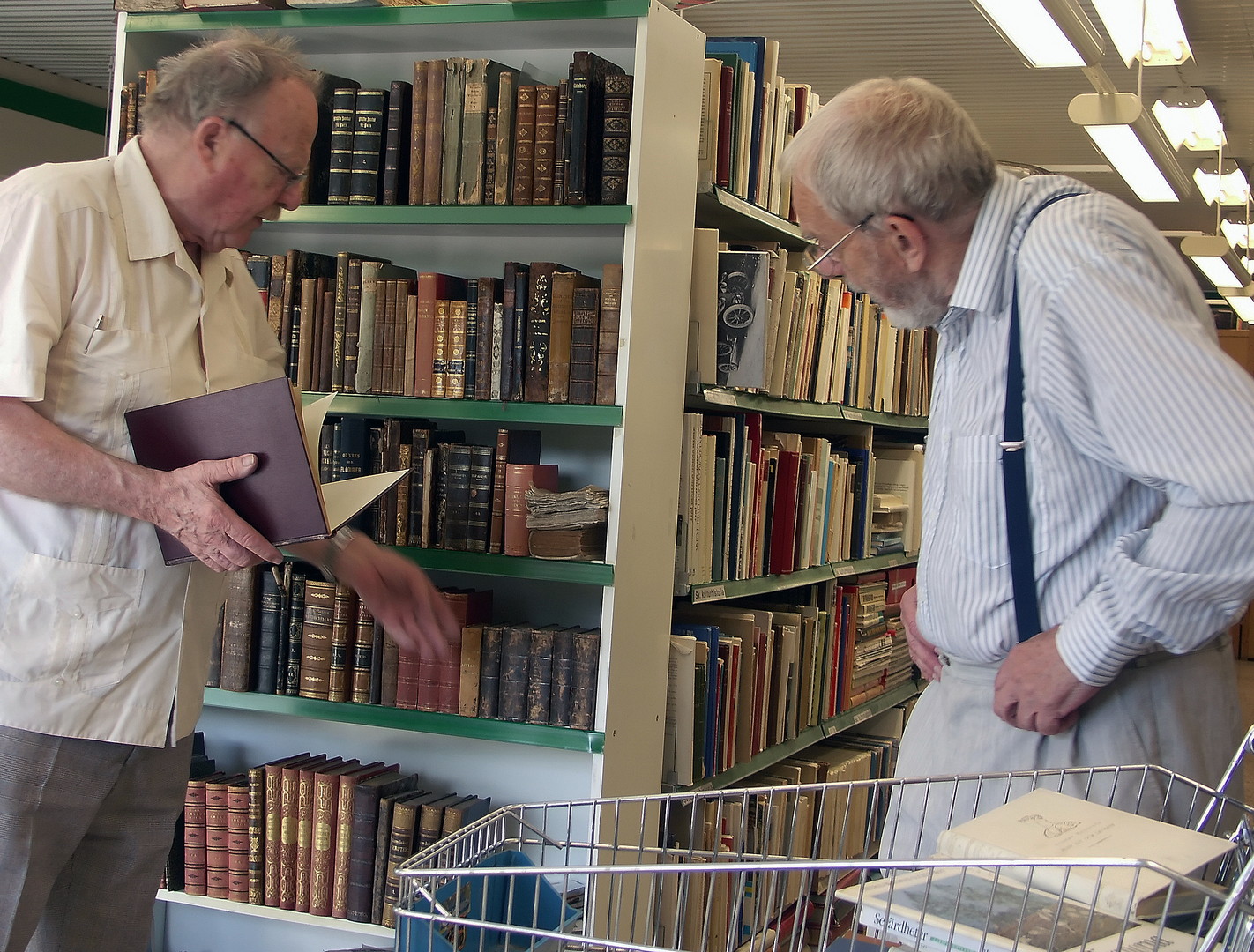 Jan Myrdal och Gun Kessle besökte Bo Björkdahls antikvariat första gången sommaren 2006. Det blev många nya volymer till Myrdals stora bibliotek. Därefter fanns det på Jan Myrdals karta; med besök när tillfälle gavs. — Foto Rune Lindström.