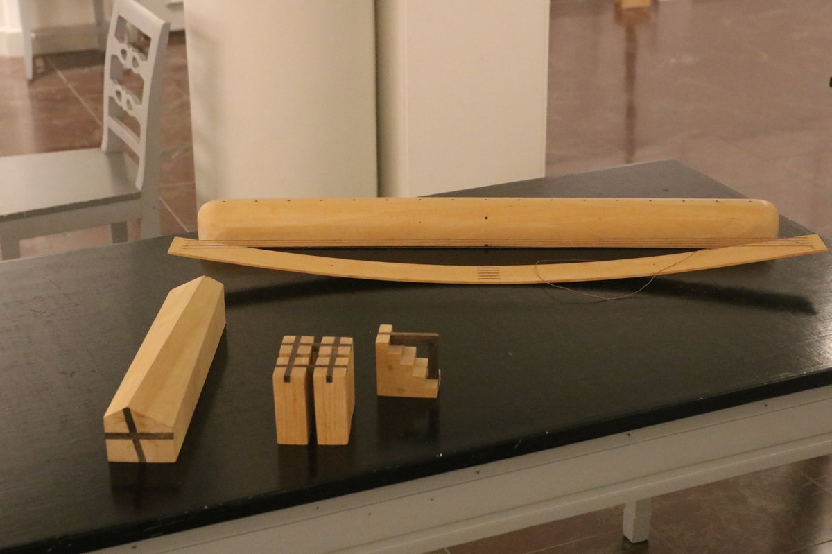 Här finns några skulpturer i ljust trä. En liknar ett instrument. Det är ospelbart. Betraktaren själv tänka sig den musik hen tycker att verket bär.