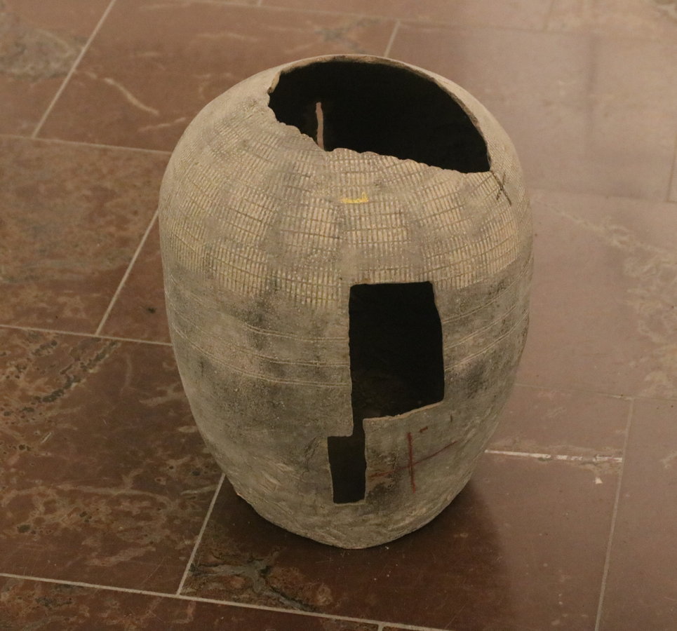 Vi kan också se keramik, kärl som andra gjort som han dekorerat eller skurit ut former ur på ett sätt som för dem från sin bruksföremålshet mot konstens ovissa tassemarker.