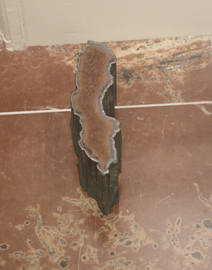 Ett tungt verk är den bild av Sverige han gjort genom att låta en laser skära ut kartbilden ur ett tjockt, massivt och rostanlöpt metallstycke.