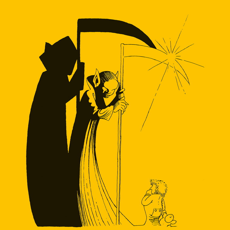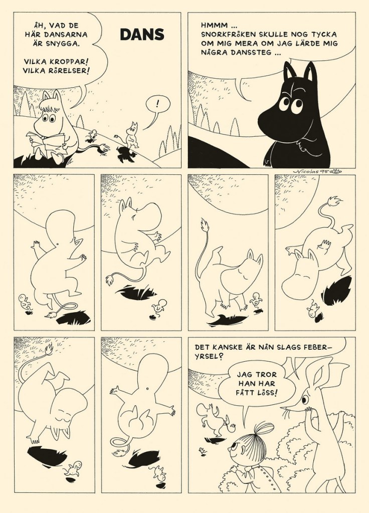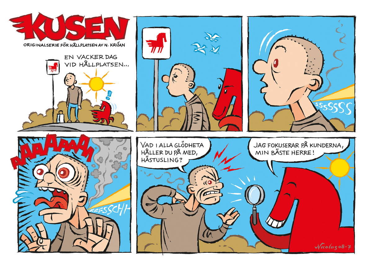 Lillen är bara ett ess i Nicolas Krizans vinnarhand. Boken, så Lillens namn den bär, visar exempel på hans mångsidighet som tecknare. Här finns logotyper och omslag till flera serietidskrifter. I flera fall hänger Lillen med på ett hörn. Här finns teckningar av olika karaktärför många olika sammanhang. Jag kan inte räkna dom alla. Undras om han kan. Flit och begåvning är ett rikt fruktbärande koncept för honom. Här finns exempel på hans arbete som Mumintecknare (såg jag inte Lillen smyga sig in i några av bilderna!?). Och många exempel på teckningar till science fiction, skräck och fantasy. Var i sin stil. Och kollektivtrafikfolkbildning full av välmenande pekpinnar. Den där lekfulla röda Kusen, pegasen i de serierna, som ska folk att ersätta apostlahästana med enligt uppdragsgivaren Dalatrafik, är inte att leka med.