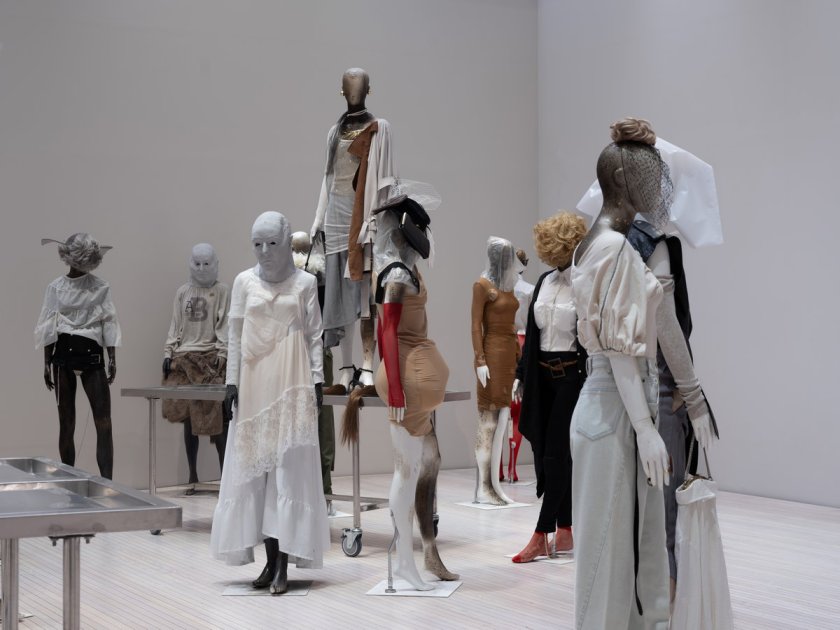 Men i det stora rummet blir motsatsen överväldigande påtaglig. Det är detta Back är känd för. Där vimlar det av skyltdockor, påklädda asymmetriska plagg, avklippta, hängande, släpande. En av besökarna säger: ”För mig är det en hop fågelskrämmor. Det kanske är vad som inspirerat henne.” Dockorna bär Halloweenmasker (dödsmasker/avgjutningar av Backs ansikte), prydda med örhängen som inte tagits bort ur butikernas plastlappar. En av dem som har en skräckfilmsmask i lammskinn bär en bikiniöverdel som bara täcker ena bröstet och som över det andra hänger som en frottehandduk (”Towel Bikini”, S/S 2003).